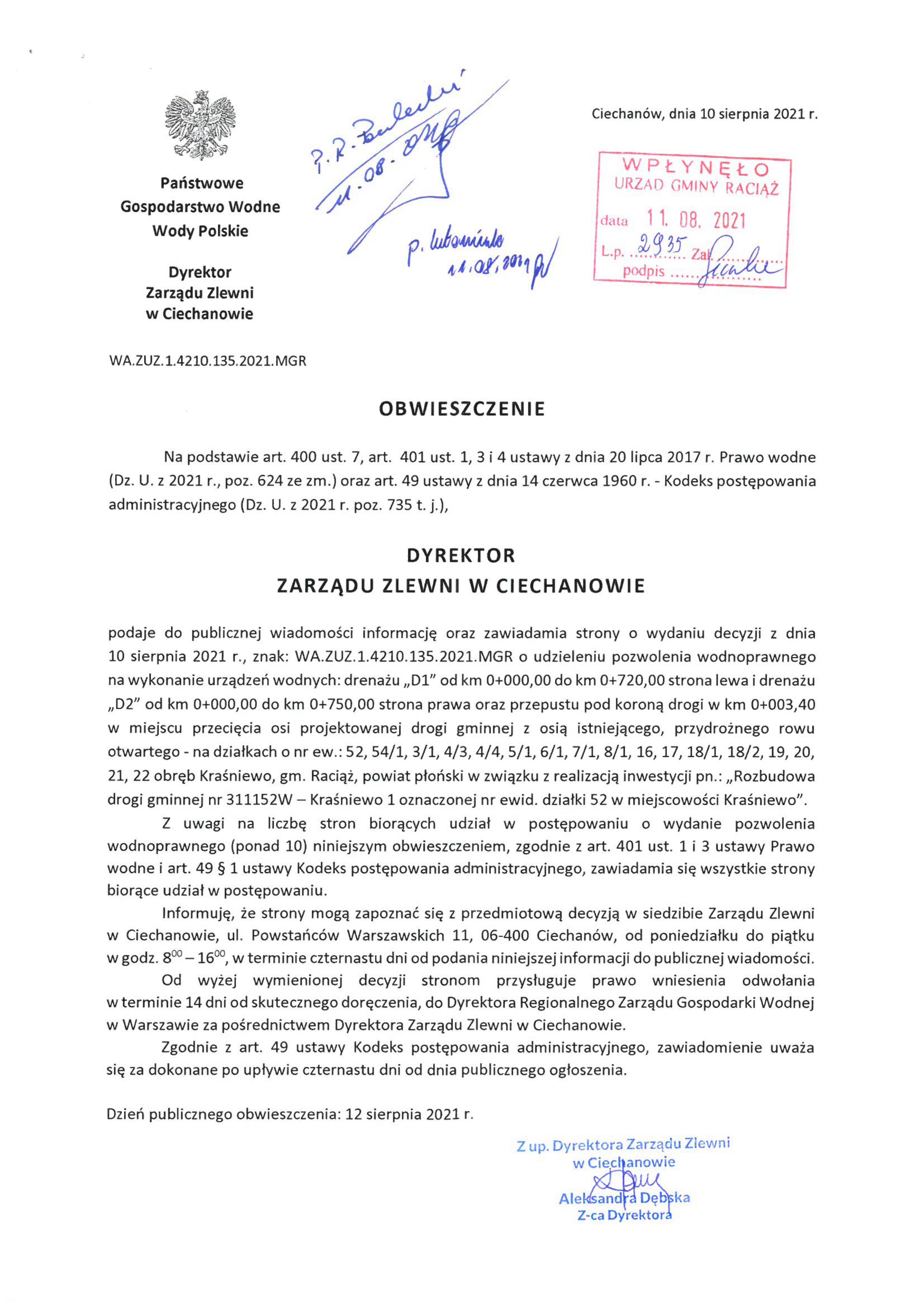 Obwieszczenie – udzielenie pozwolenia wodnoprawnego na wykonanie urządzeń wodnych, tj. wykonanie drenażu D1 i D2 w związku z realizacją inwestycji gminnej pn.