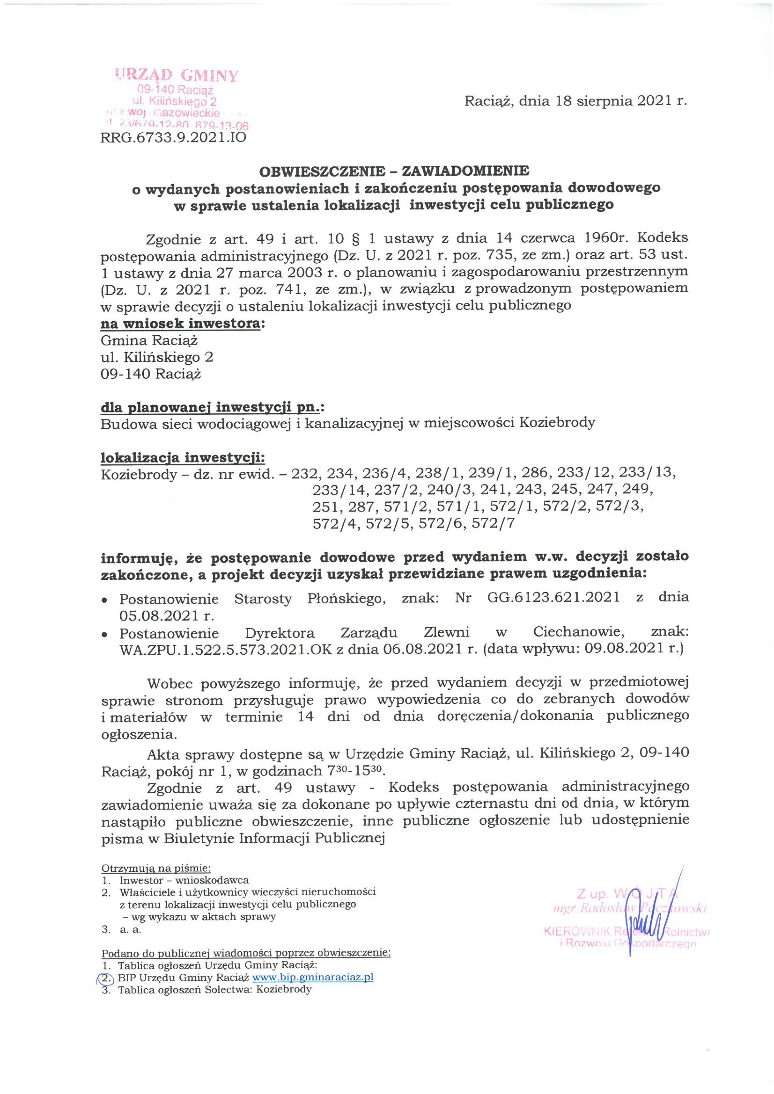 9.2021 Cel Publiczny - Obwieszczenie o wydanych postanowieniach i zakończeniu postepowania pn. Budowa sieci wodociągowej i kanalizacyjnej w miejscowości Koziebrody