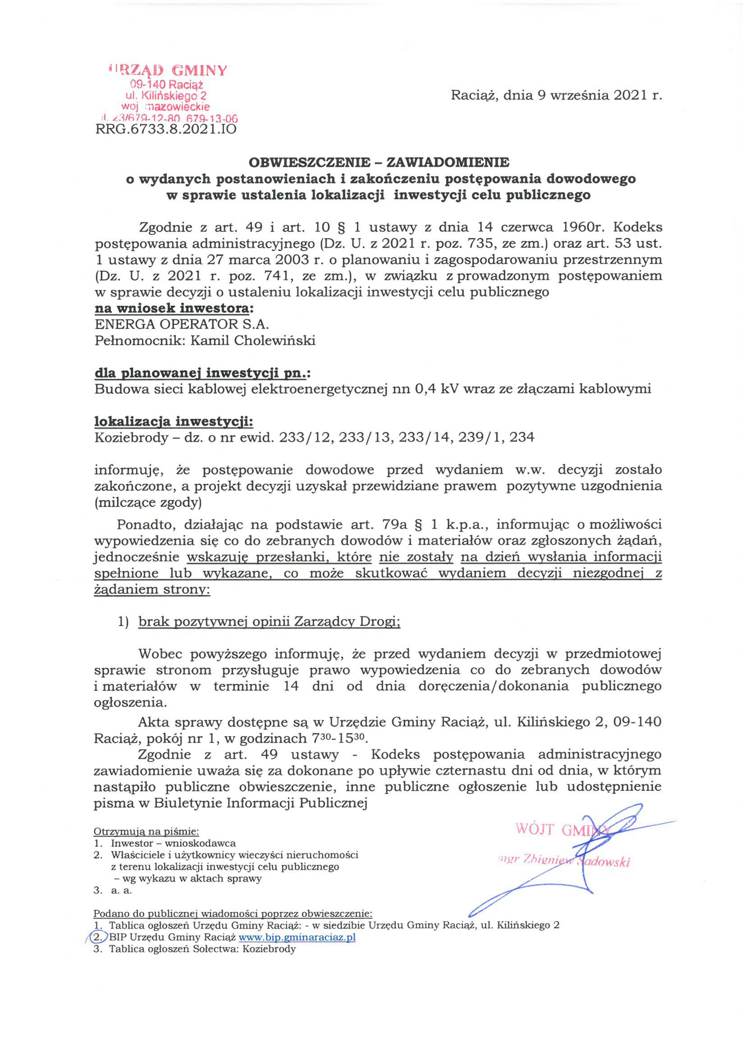 8.2021 Cel Publiczny – Obwieszczenie o wydanych postanowieniach i zakończeniu postępowania pn. Budowa sieci kablowej elektroenergetycznej nn 0,4kV wraz ze złączami kablowymi w miejscowości Koziebrody.