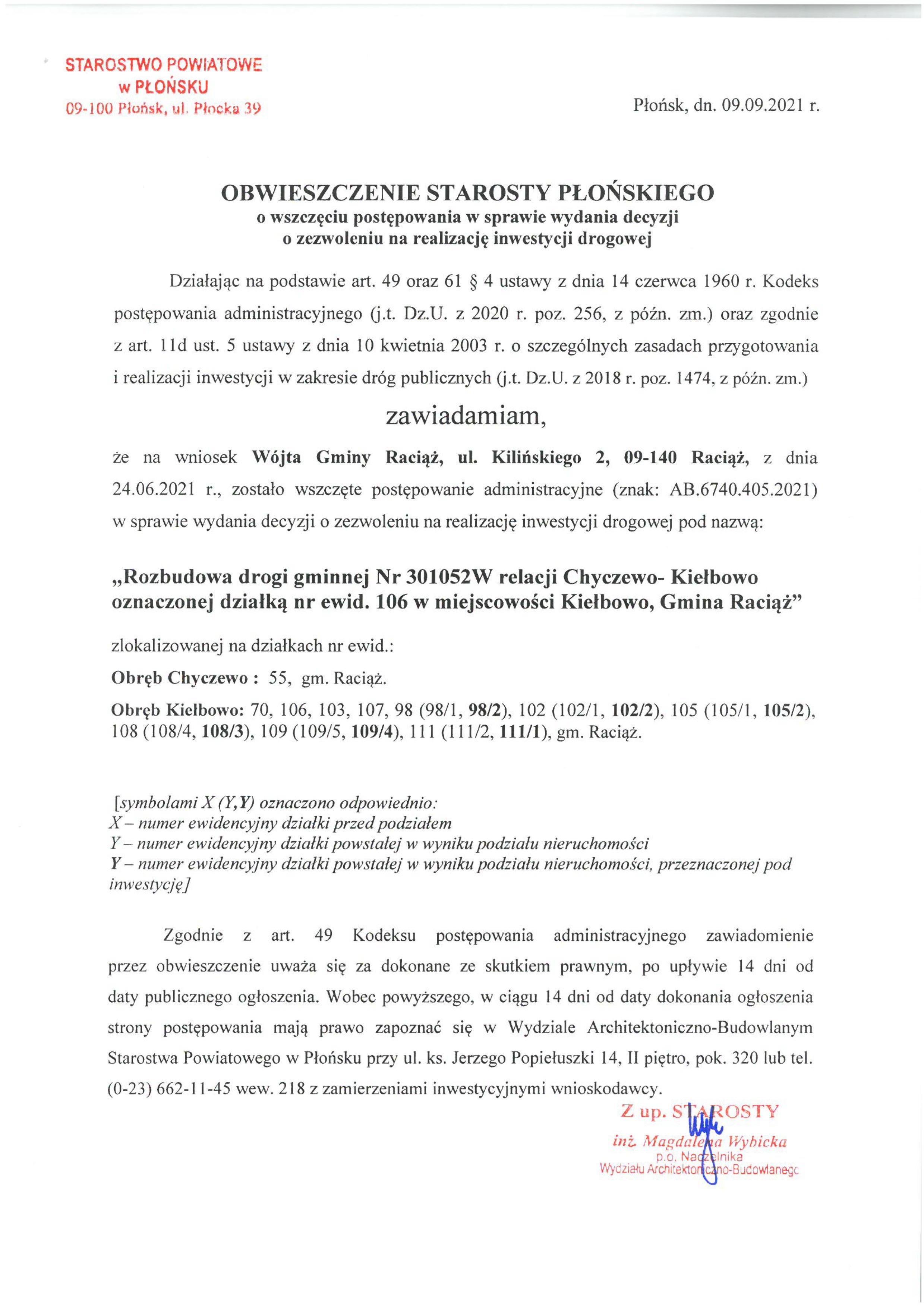 Obwieszczenie Starosty Płońskiego o wszczęciu postępowania pn. Rozbudowa drogi gminnej Nr 301052W w relacji Chyczewo-Kiełbowo oznaczonej działką nr ewid. 106 w miejscowości Kiełbowo, gmina Raciąż.