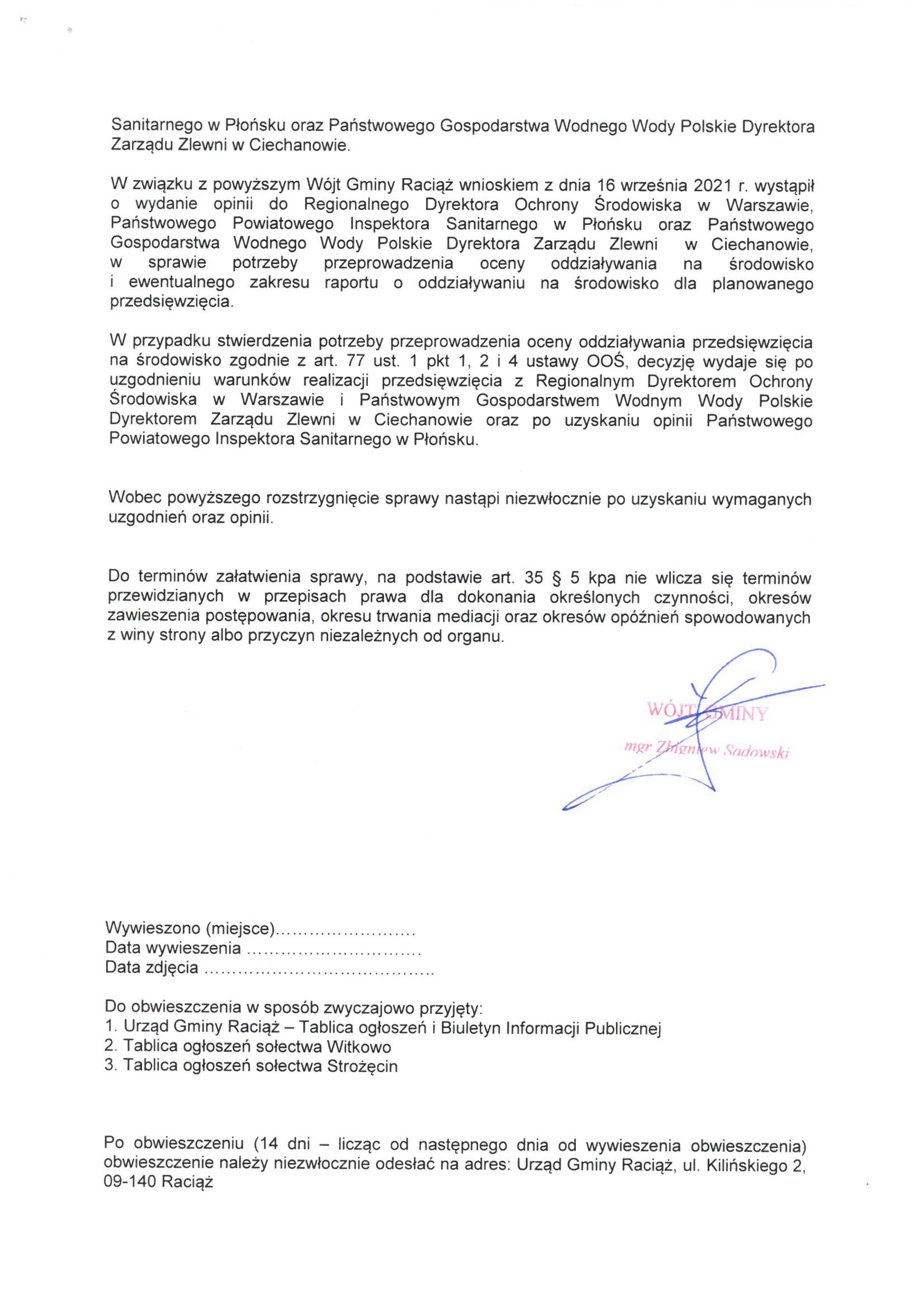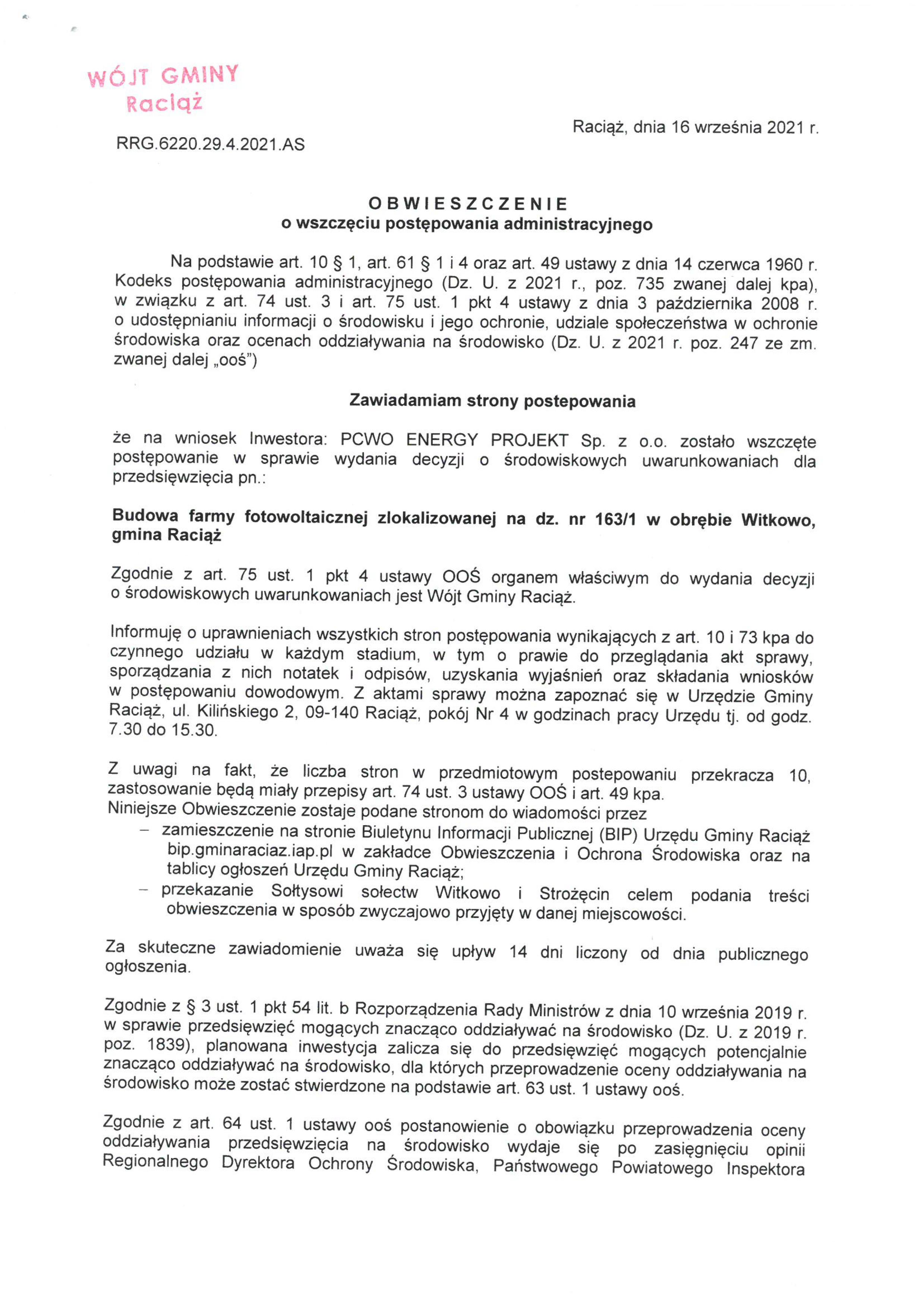 Budowa farmy fotowoltaicznej zlokalizowanej na dz. nr 163/1 w obrębie Witkowo, gmina Raciąż