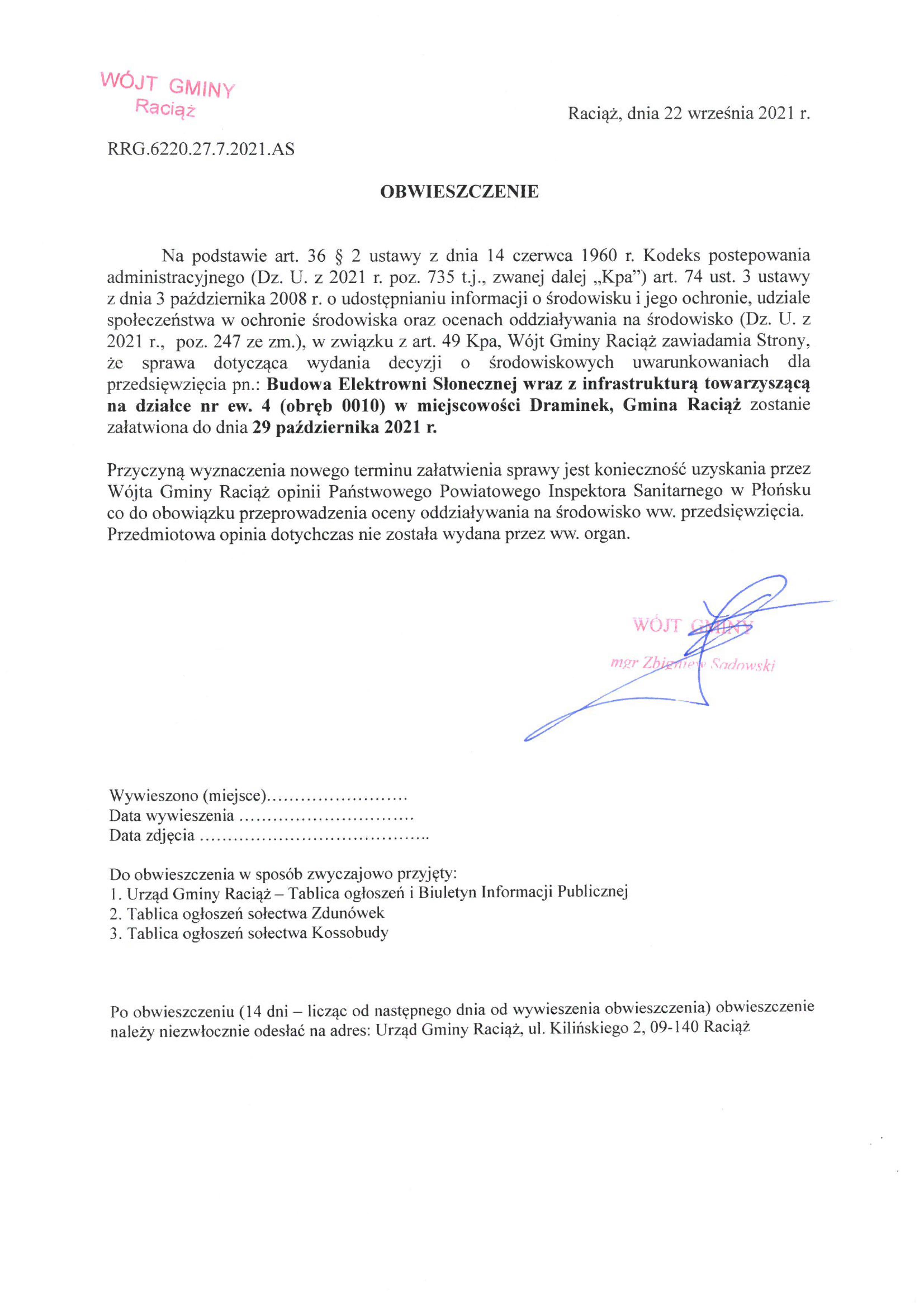 Budowa Elektrowni Słonecznej wraz z infrastrukturą towarzyszącą na działce nr ew. 4 (obręb 0010) w miejscowości Draminek, Gmina Raciąż