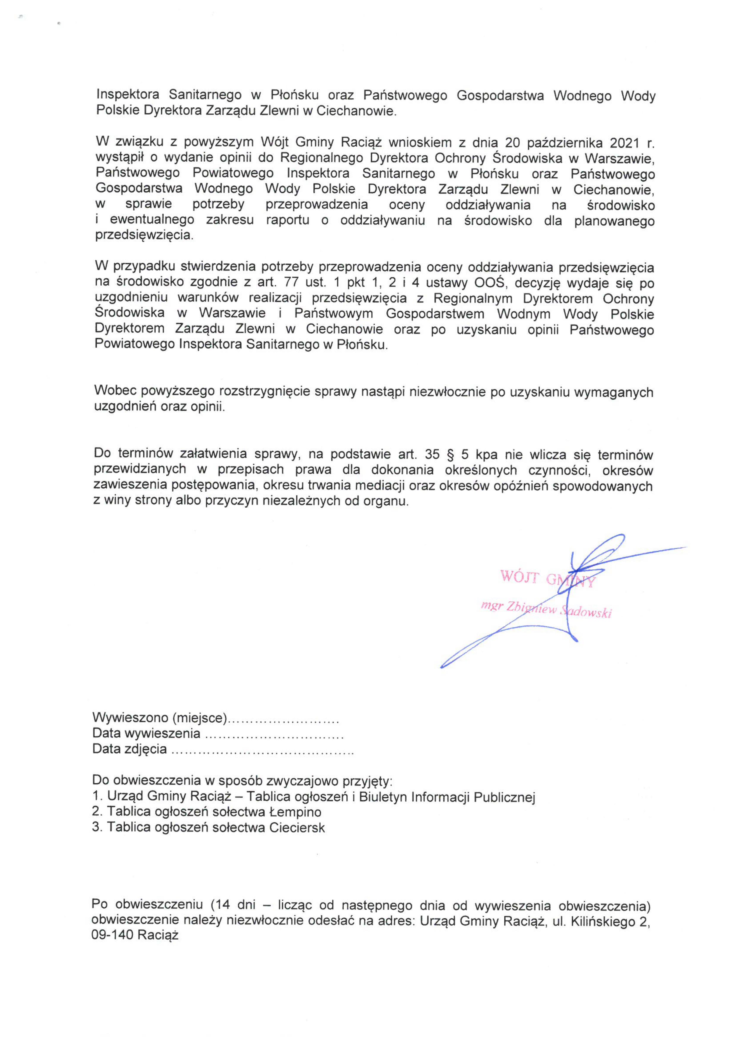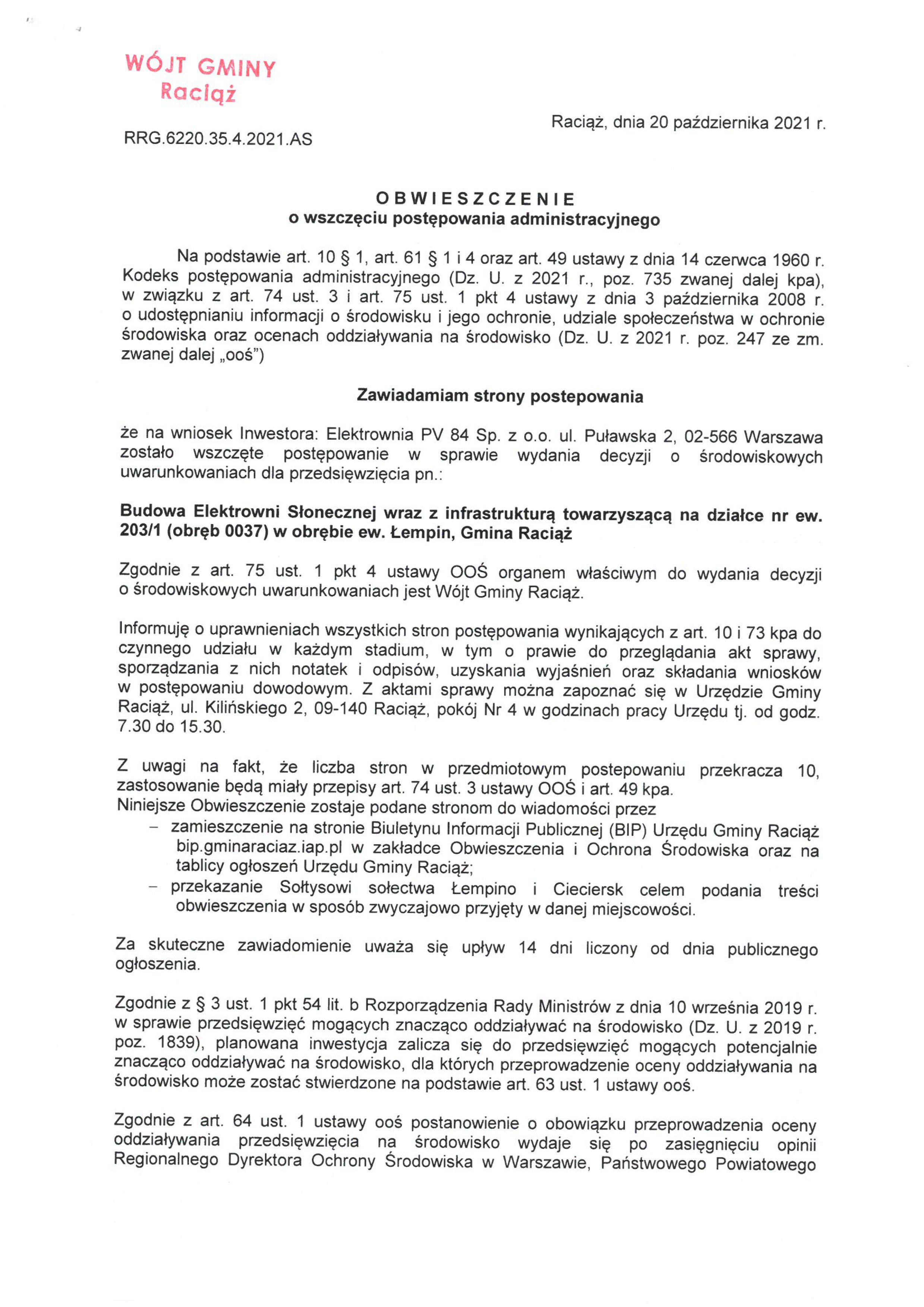 Budowa Elektrowni Słonecznej wraz z infrastrukturą towarzyszącą na działce nr ew. 203/1 (obręb 0037) w obrębie ew. Łempin, Gmina Raciąż