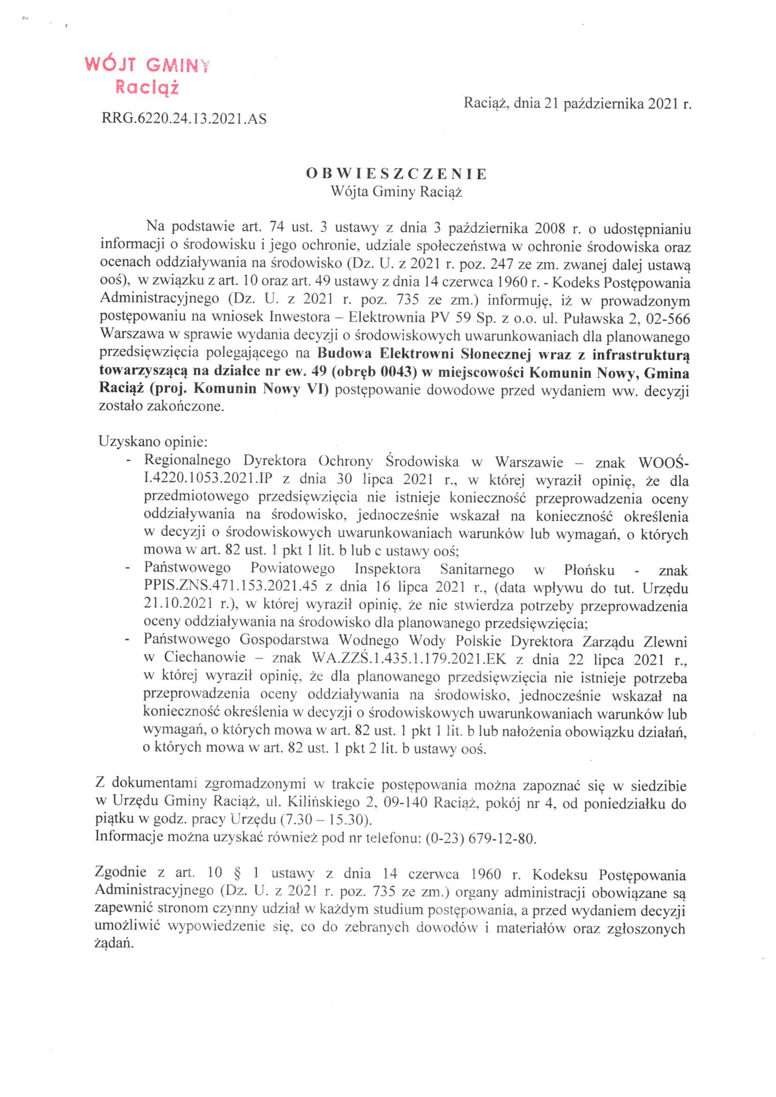 Budowa Elektrowni Słonecznej wraz z infrastrukturą towarzyszącą na działce nr ew. 49 (obręb 0043) w miejscowości Komunin Nowy, Gmina Raciąż (proj. Komunin Nowy VI