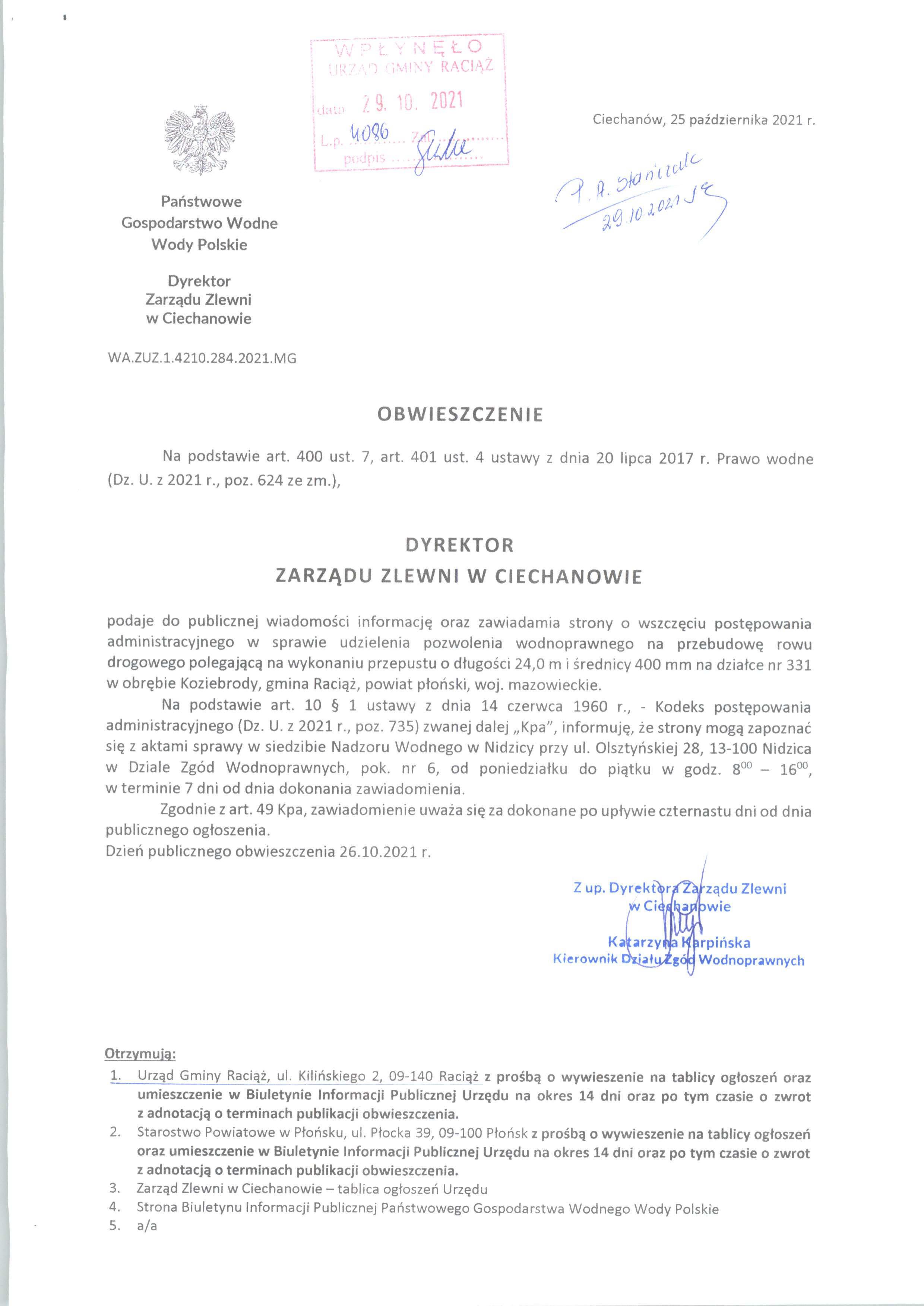 Obwieszczenie Dyrektora Zarządu Zlewni w Ciechanowie