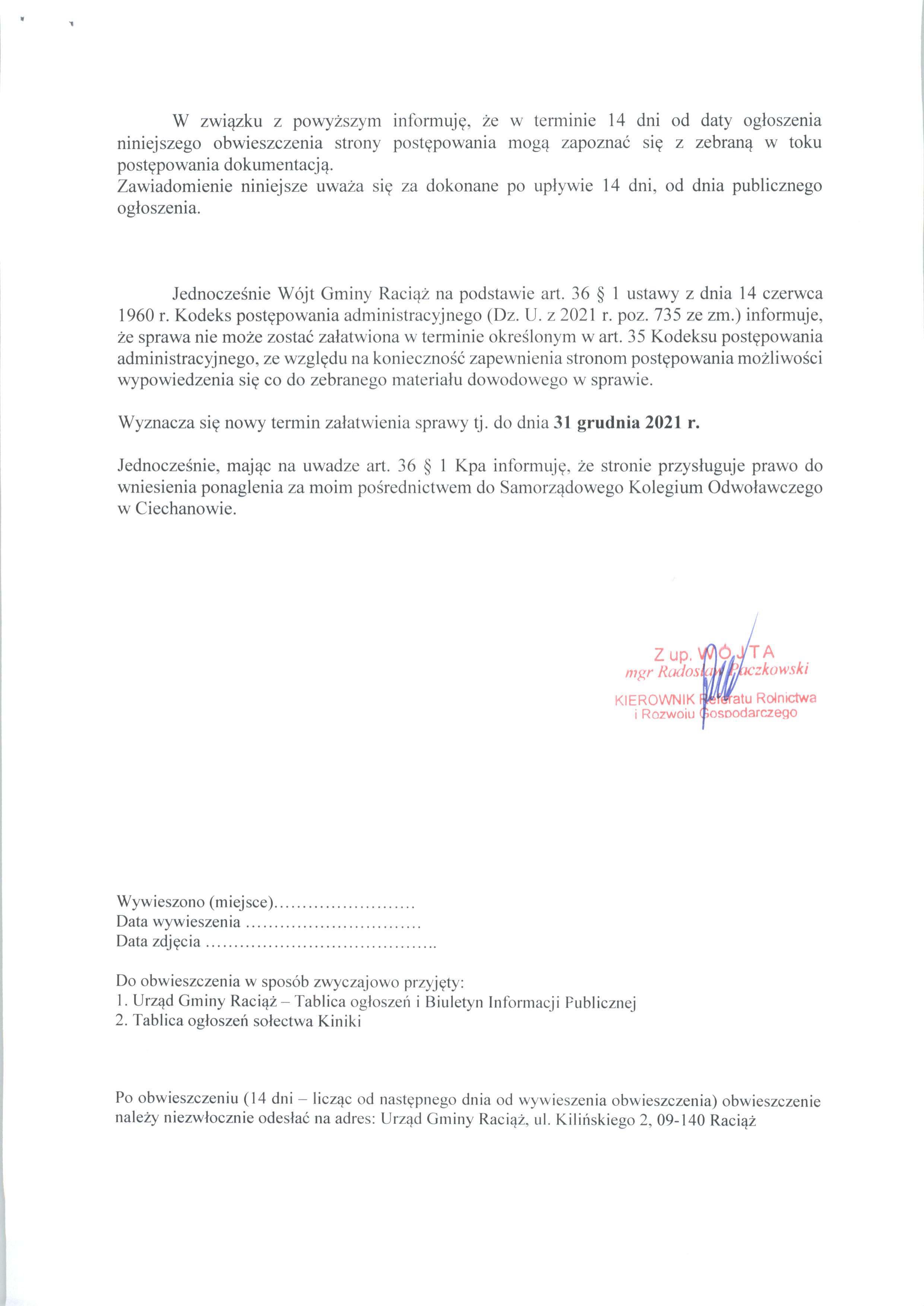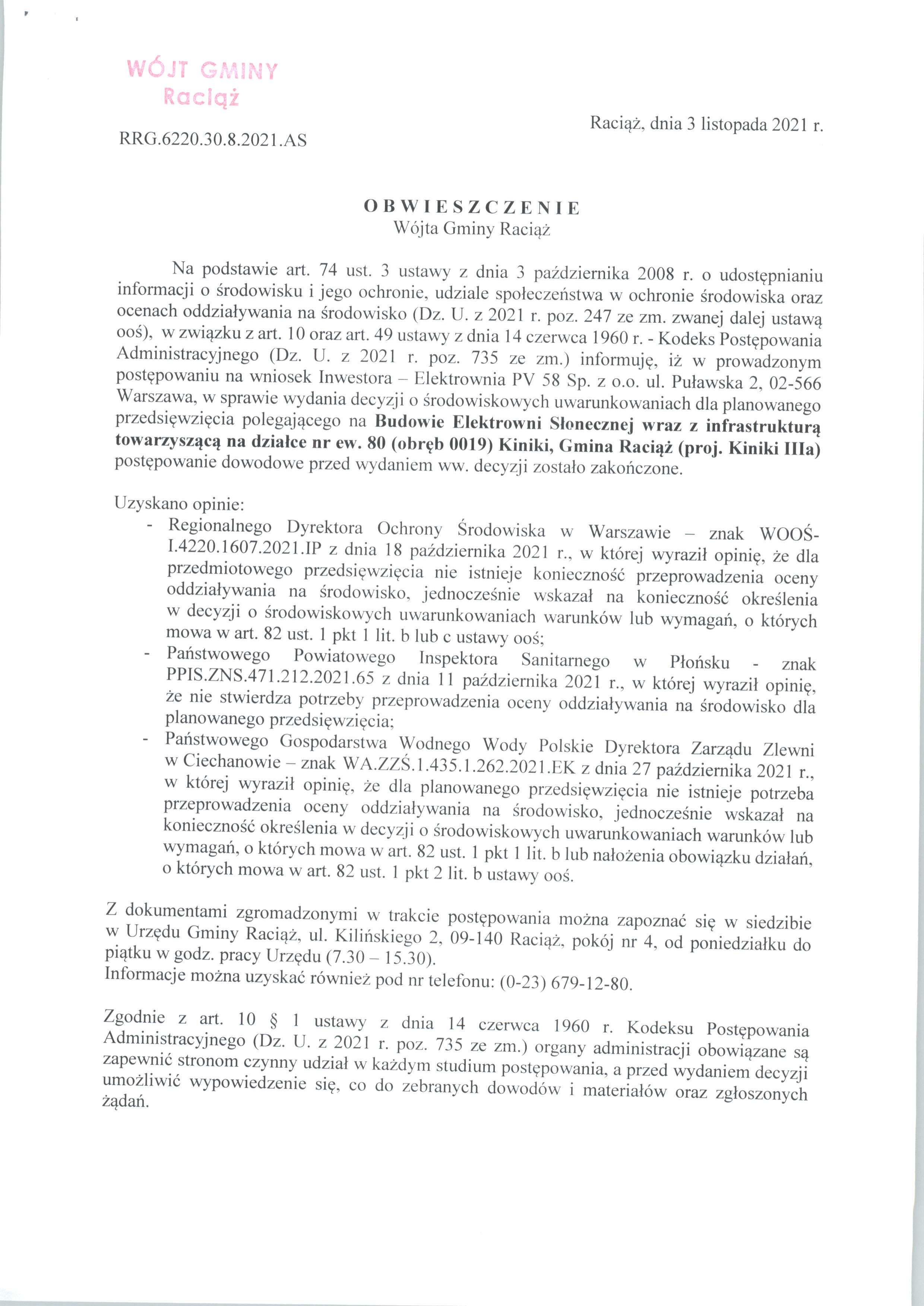 Budowa Elektrowni Słonecznej wraz z infrastrukturą towarzyszącą na działce nr ew. 80 (obręb 0019) Kiniki, Gmina Raciąż (proj. Kiniki IIIa)