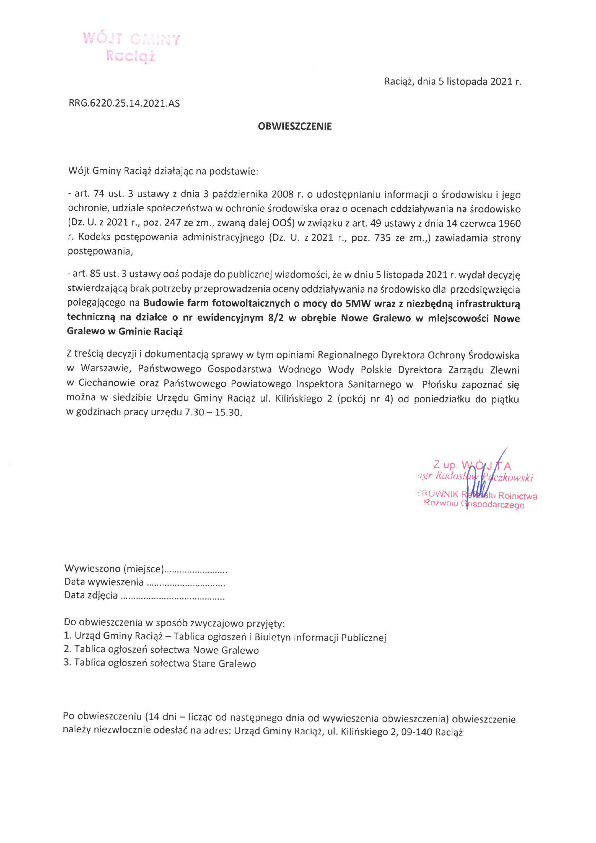 Budowa farm fotowoltaicznych o mocy do 5MW wraz z niezbędną infrastrukturą techniczną na działce o nr ewidencyjnym 8/2 w obrębie Nowe Gralewo w miejscowości Nowe Gralewo w Gminie Raciąż