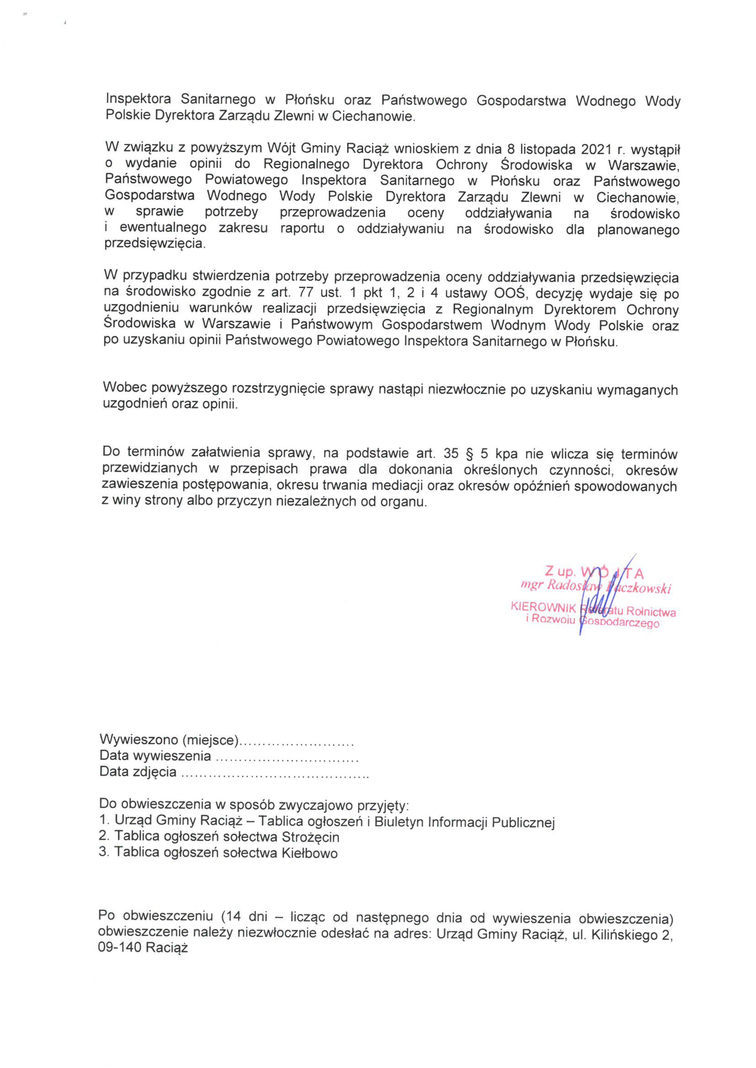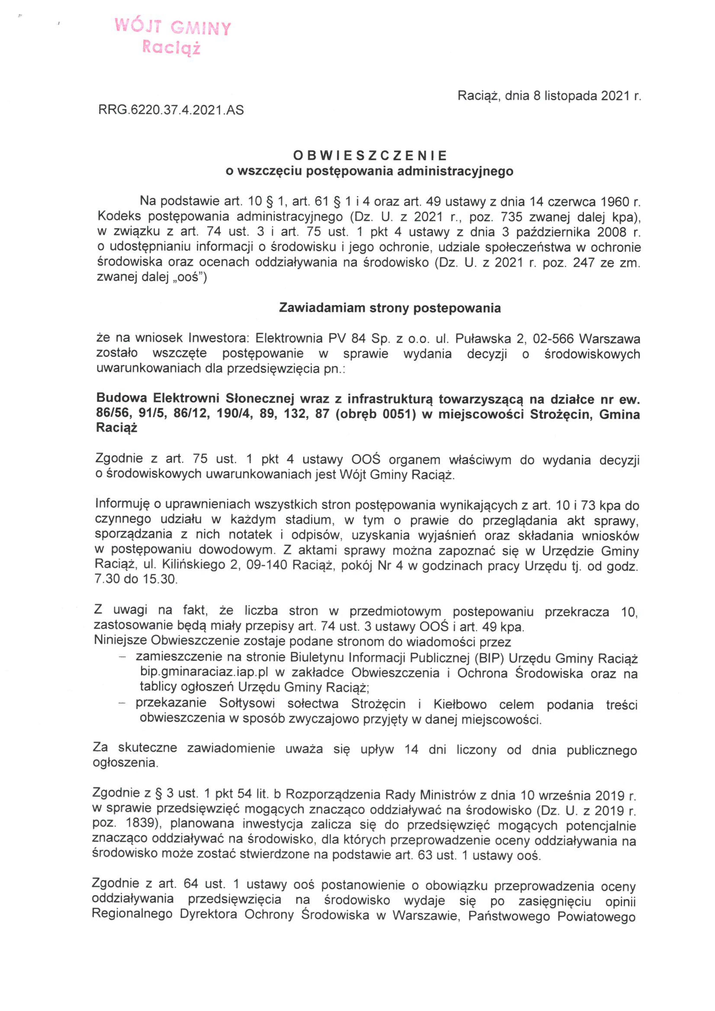Budowa Elektrowni Słonecznej wraz z infrastrukturą towarzyszącą na działce nr ew. 86/56, 91/5, 86/12, 190/4, 89, 132, 87 (obręb 0051) w miejscowości Strożęcin, Gmina Raciąż