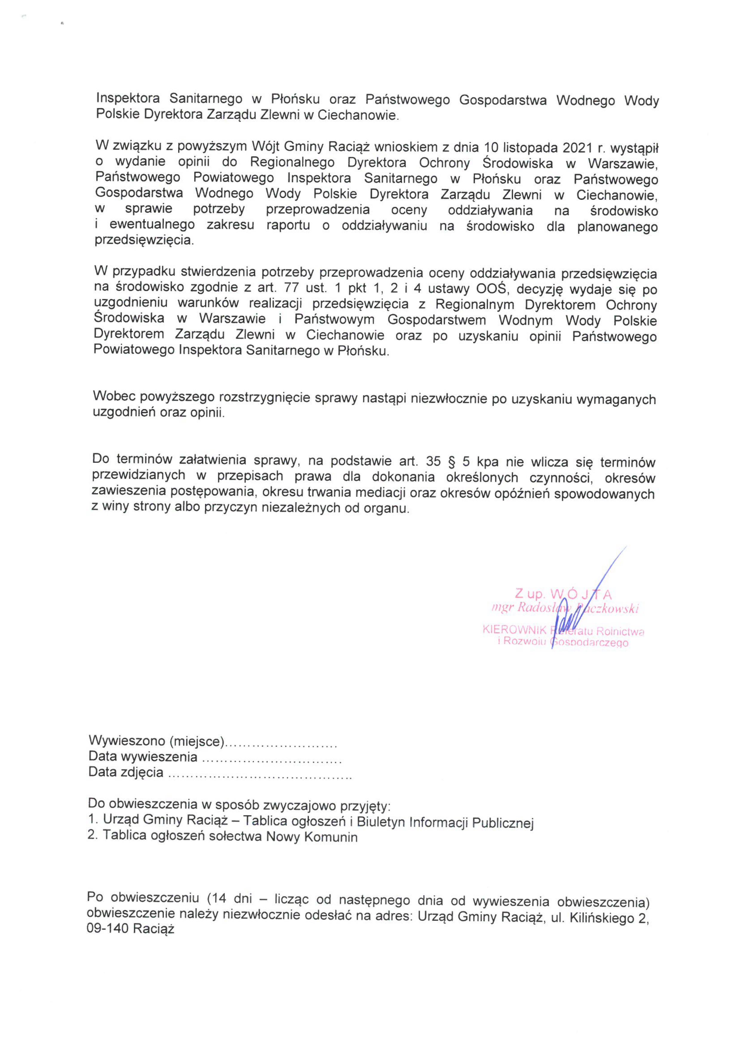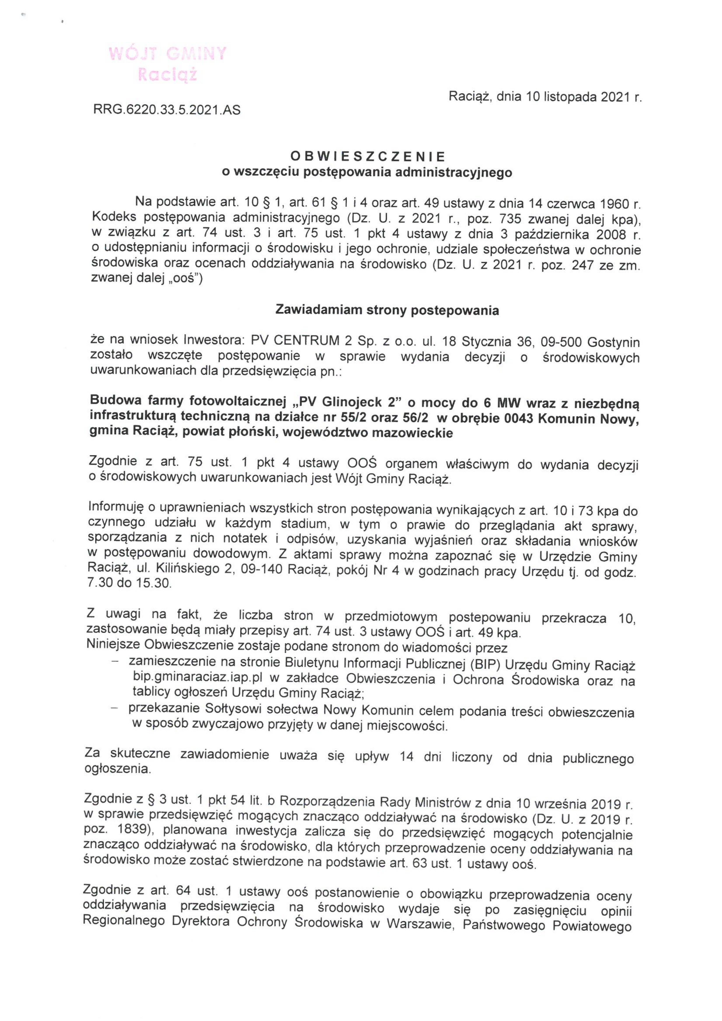 Budowa farmy fotowoltaicznej „PV Glinojeck 2” o mocy do 6 MW wraz z niezbędną infrastrukturą techniczną na działce nr 55/2 oraz 56/2 w obrębie 0043 Komunin Nowy, gmina Raciąż, powiat płoński, województwo mazowieckie