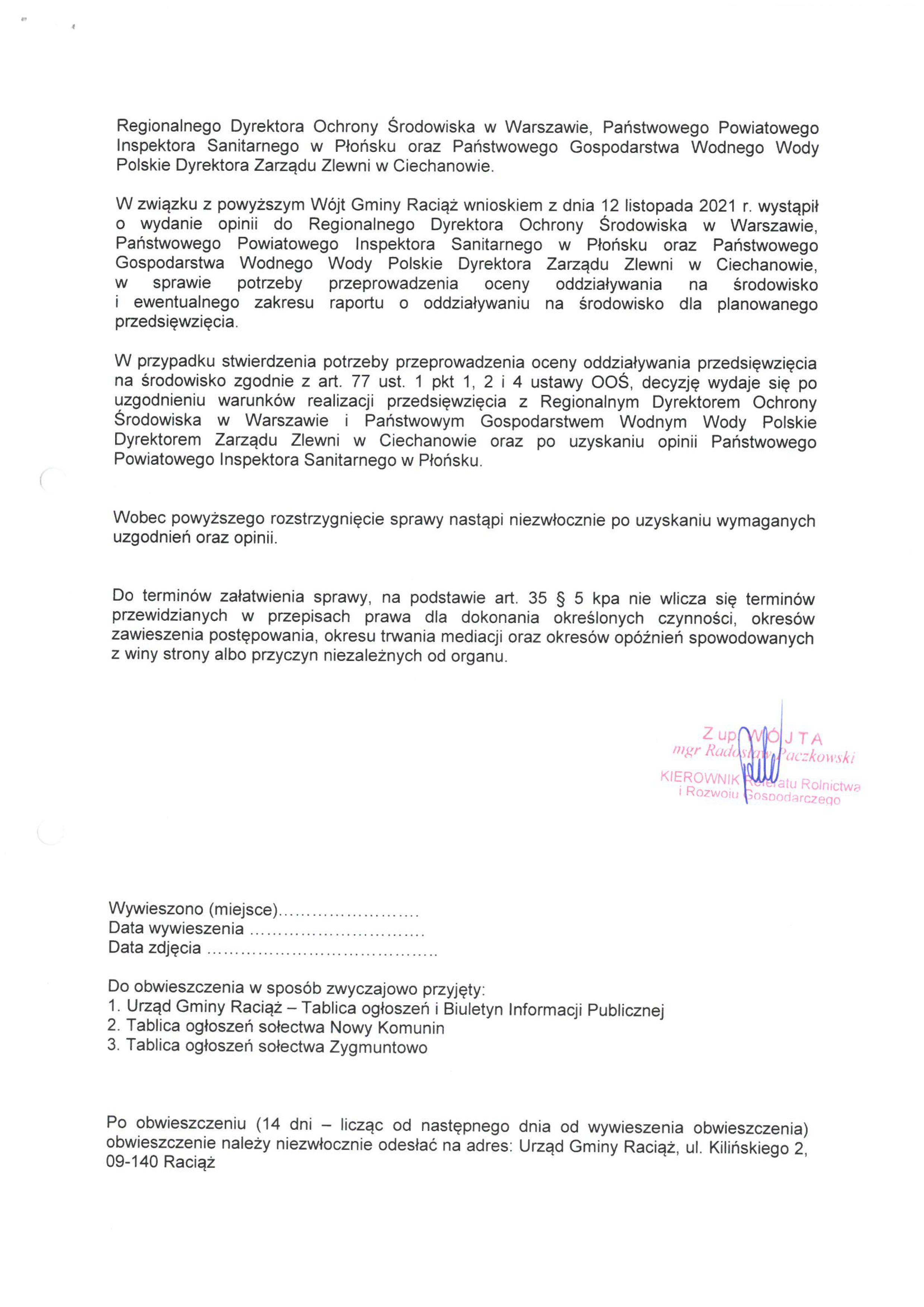 Budowa Farmy fotowoltaicznej „PV Glinojeck 1” o mocy do 3 MW wraz z niezbędną infrastrukturą techniczną na działce nr 71/1 w obrębie Komunin Nowy, gmina Raciąż, powiat płoński, województwo mazowieckie