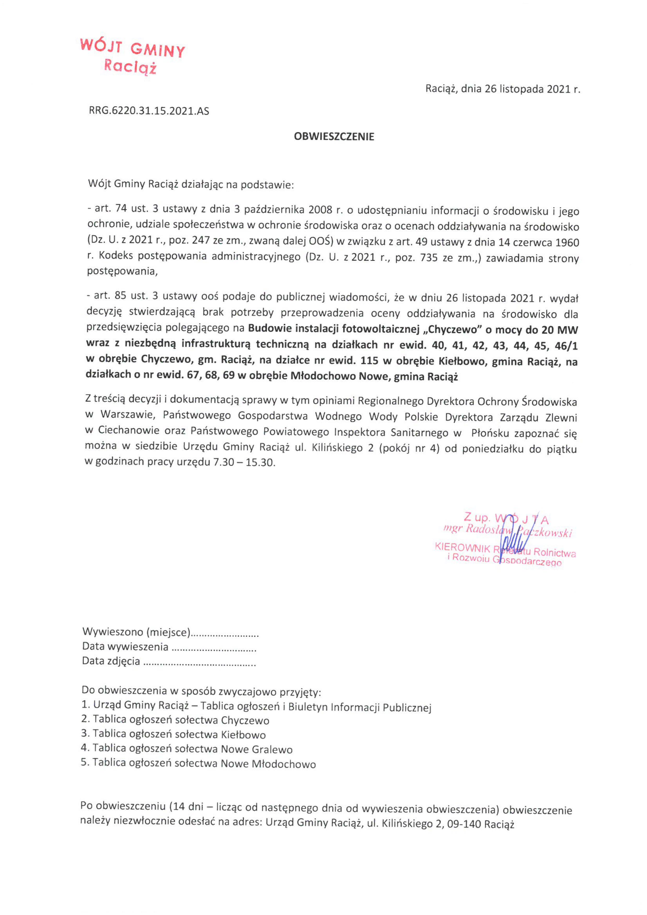 Budowa instalacji fotowoltaicznej „Chyczewo” o mocy do 20 MW wraz z niezbędną infrastrukturą techniczną na działkach