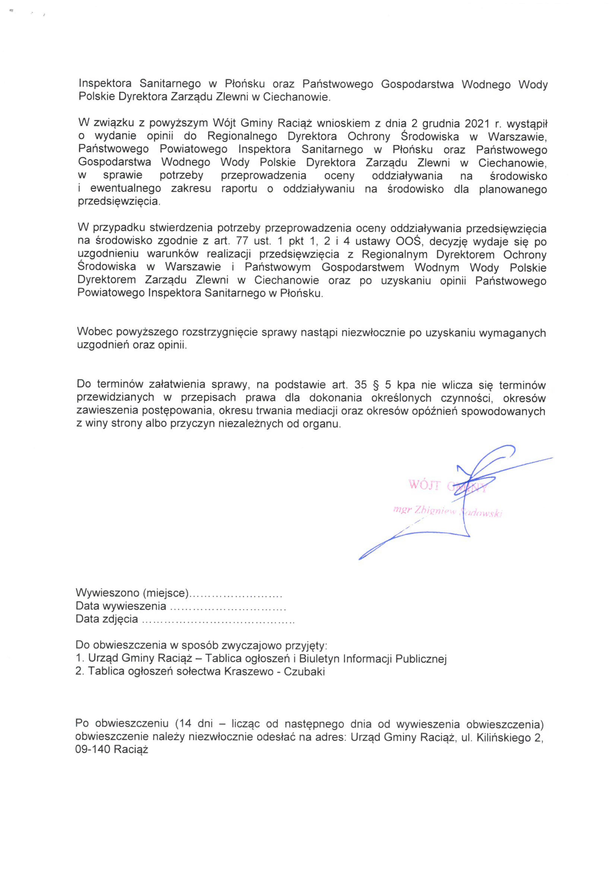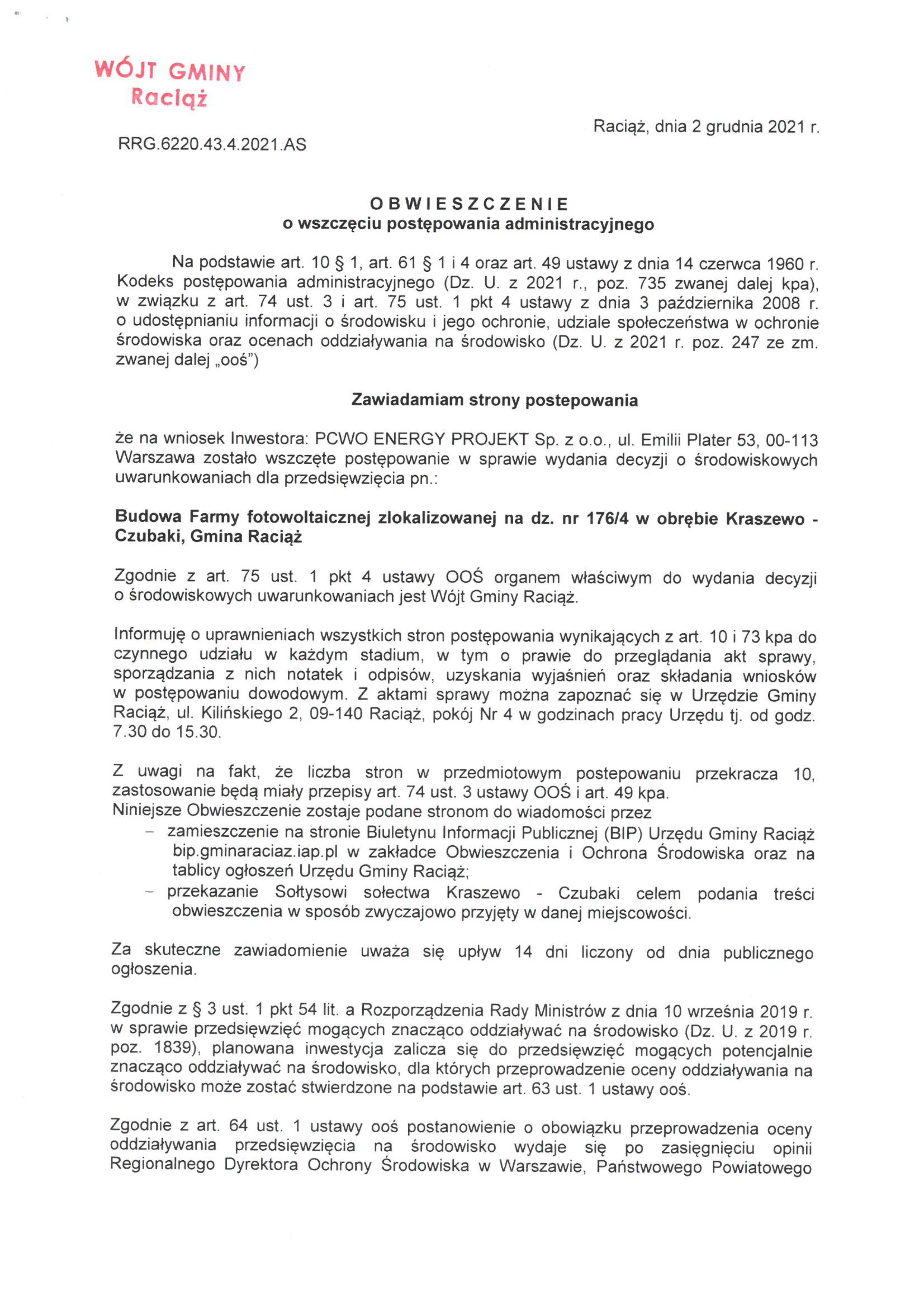 Budowa Farmy fotowoltaicznej zlokalizowanej na dz. nr 176/4 w obrębie Kraszewo - Czubaki, Gmina Raciąż