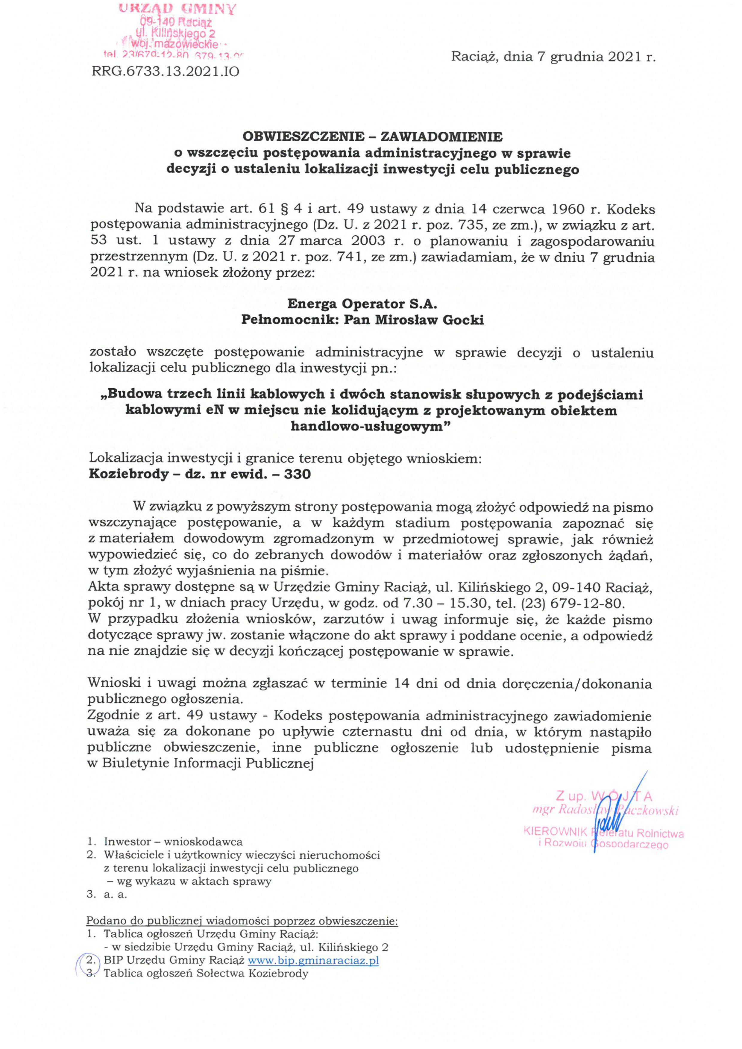Obwieszczenie o wszczęciu postępowania pn. budowa trzech linii kablowych i dwóch stanowisk słupowych z podejściami kablowymi eN w miejscu nie kolidującym z projektowanym obiektem handlowo-usługowym w miejscowości Koziebrody