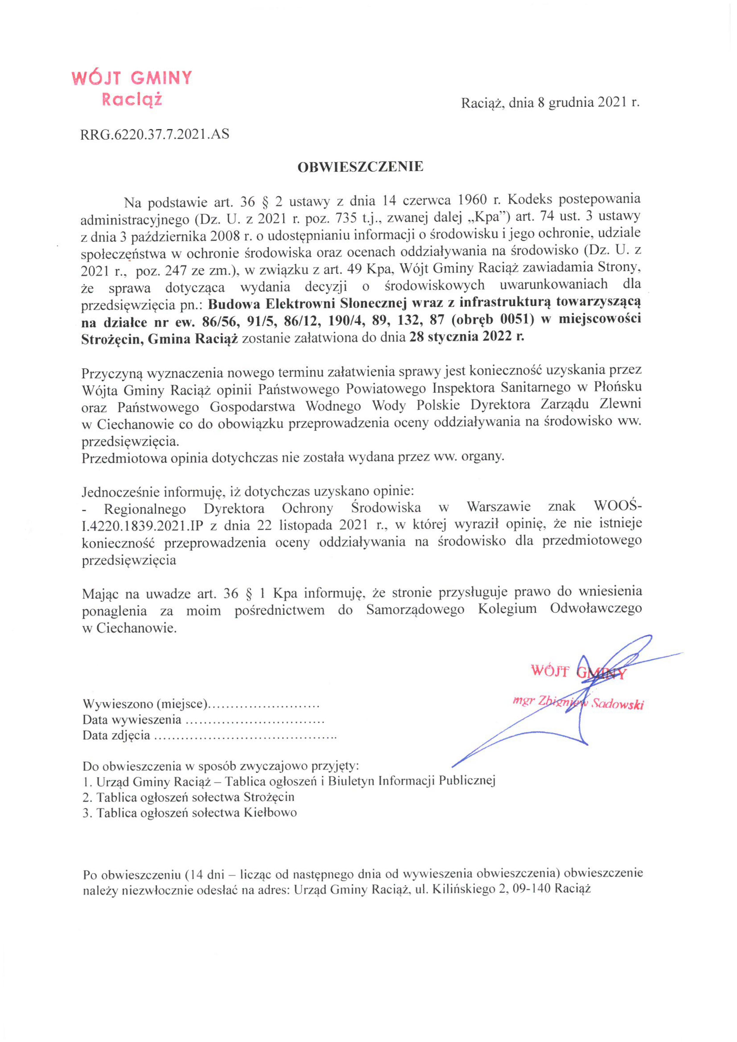 Budowa Elektrowni Słonecznej wraz z infrastrukturą towarzyszącą na działce nr ew. 86/56, 91/5, 86/12, 190/4, 89, 132, 87 (obręb 0051) w miejscowości Strożęcin, Gmina Raciąż