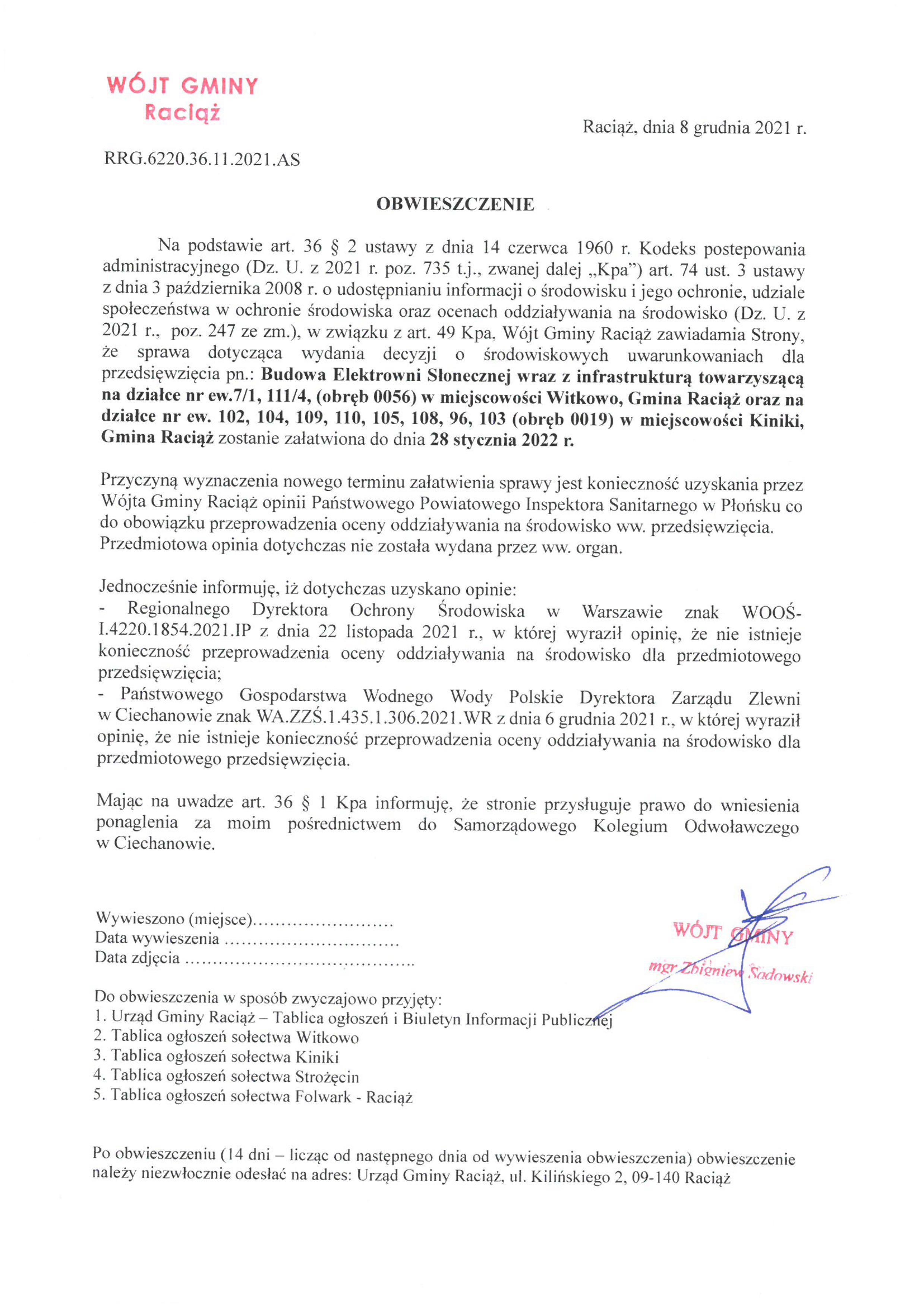 Budowa Elektrowni Słonecznej wraz z infrastrukturą towarzyszącą na działce nr ew.7/1, 111/4, (obręb 0056) w miejscowości Witkowo, Gmina Raciąż oraz na działce nr ew. 102, 104, 109, 110, 105, 108, 96, 103 (obręb 0019) w miejscowości Kiniki, Gmina Raciąż