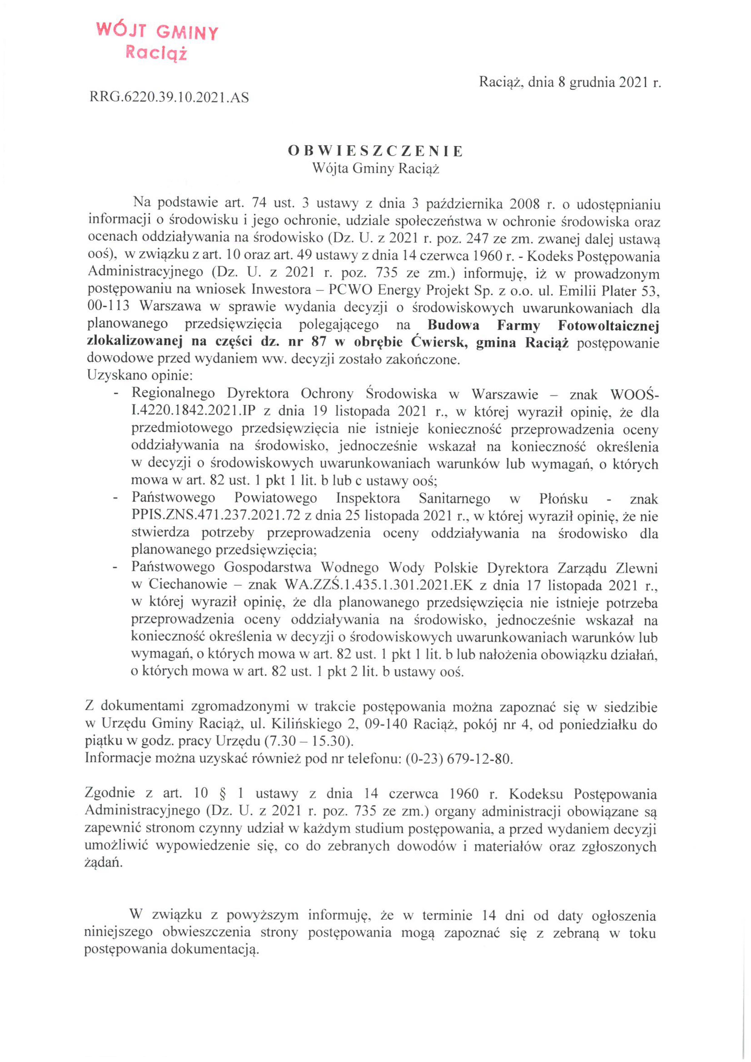 Budowa Farmy Fotowoltaicznej zlokalizowanej na części dz. nr 87 w obrębie Ćwiersk, gmina Raciąż