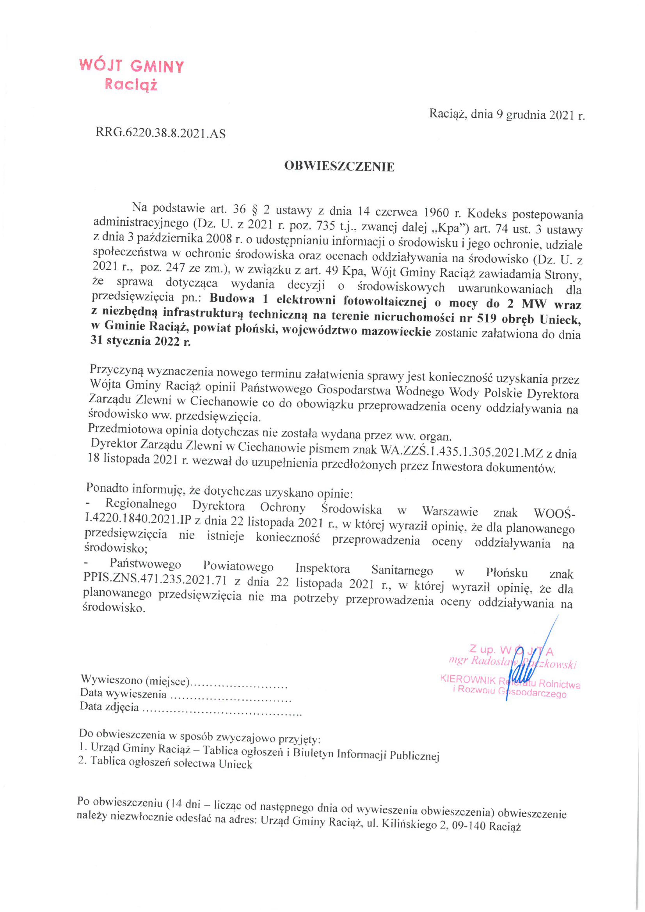 Budowa 1 elektrowni fotowoltaicznej o mocy do 2 MW wraz z niezbędną infrastrukturą techniczną na terenie nieruchomości nr 519 obręb Unieck, w Gminie Raciąż, powiat płoński, województwo mazowieckie
