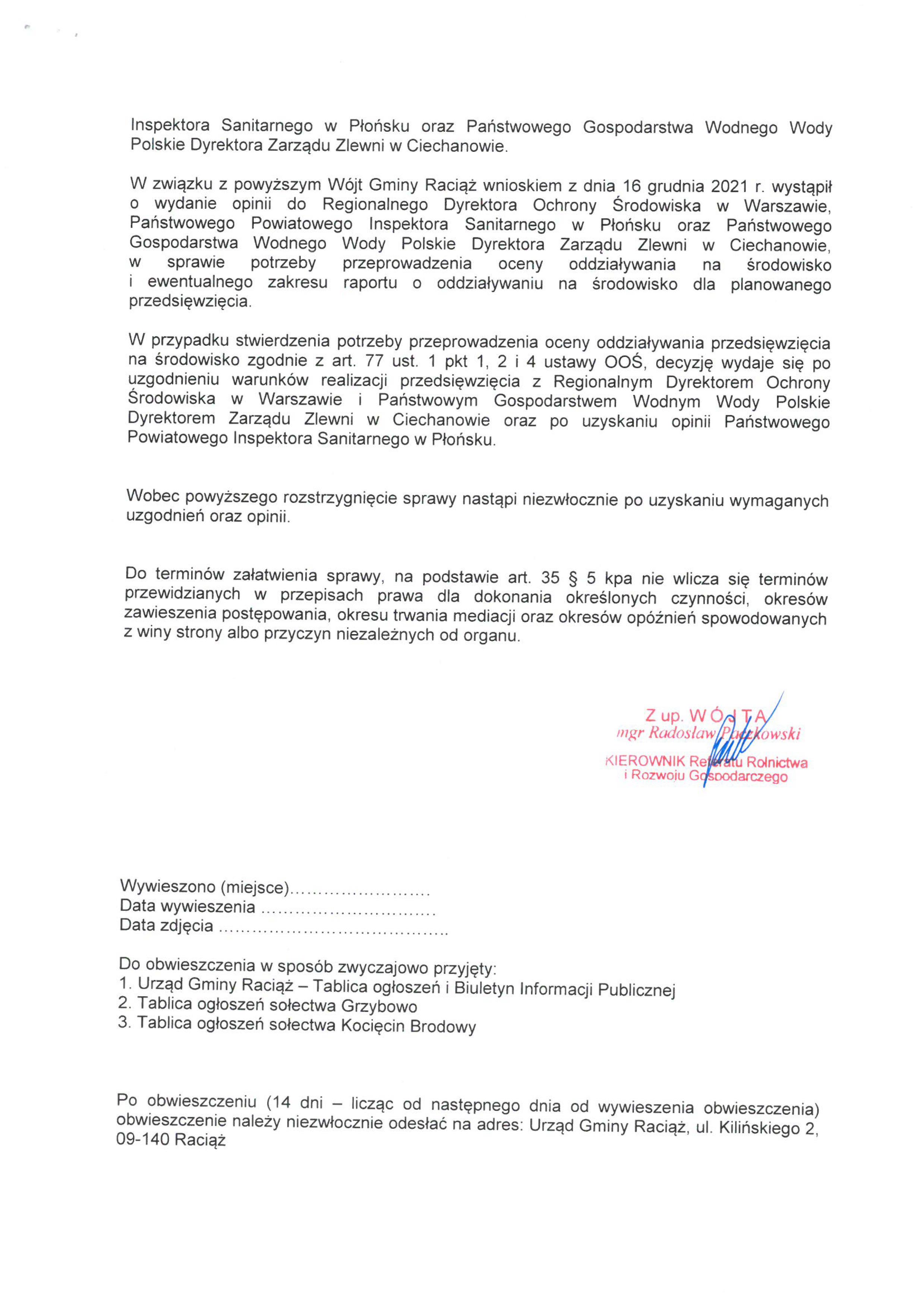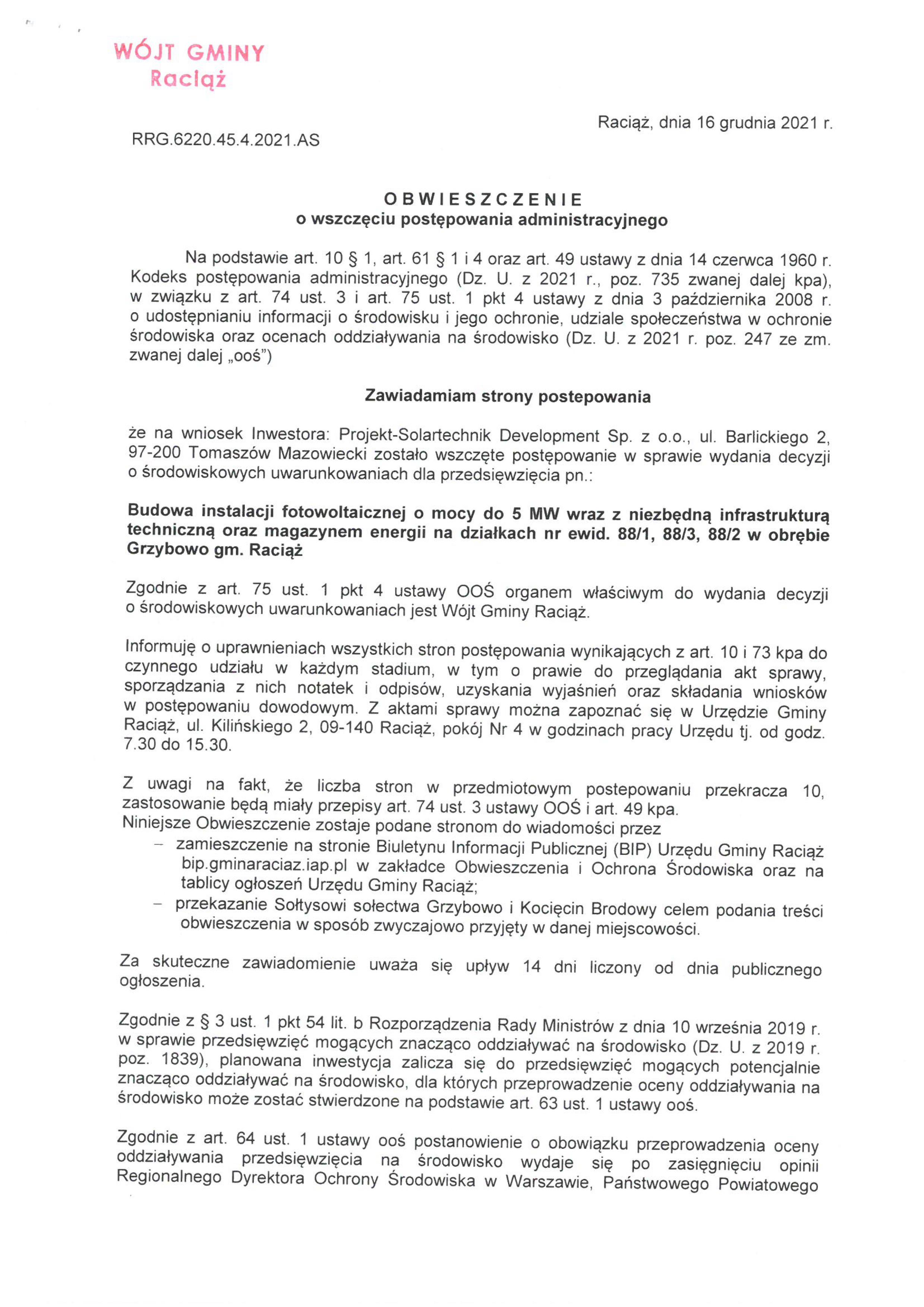 Budowa instalacji fotowoltaicznej o mocy do 5 MW wraz z niezbędną infrastrukturą techniczną oraz magazynem energii na działkach nr ewid. 88/1, 88/3, 88/2 w obrębie Grzybowo gm. Raciąż
