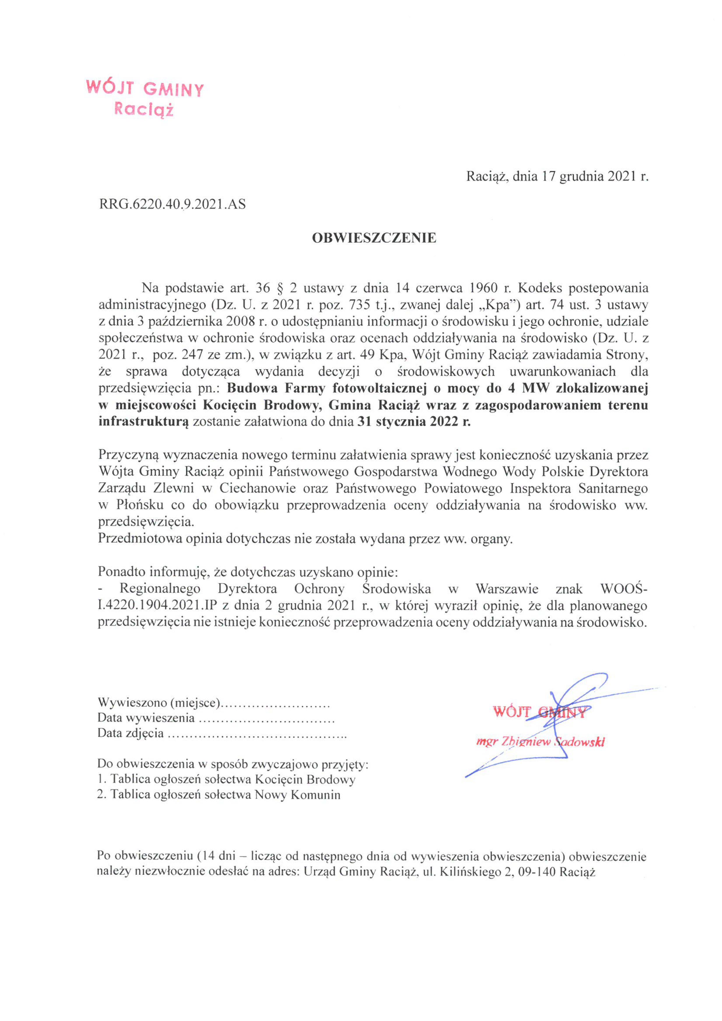 Budowa Farmy fotowoltaicznej o mocy do 4 MW zlokalizowanej w miejscowości Kocięcin Brodowy, Gmina Raciąż wraz z zagospodarowaniem terenu infrastrukturą