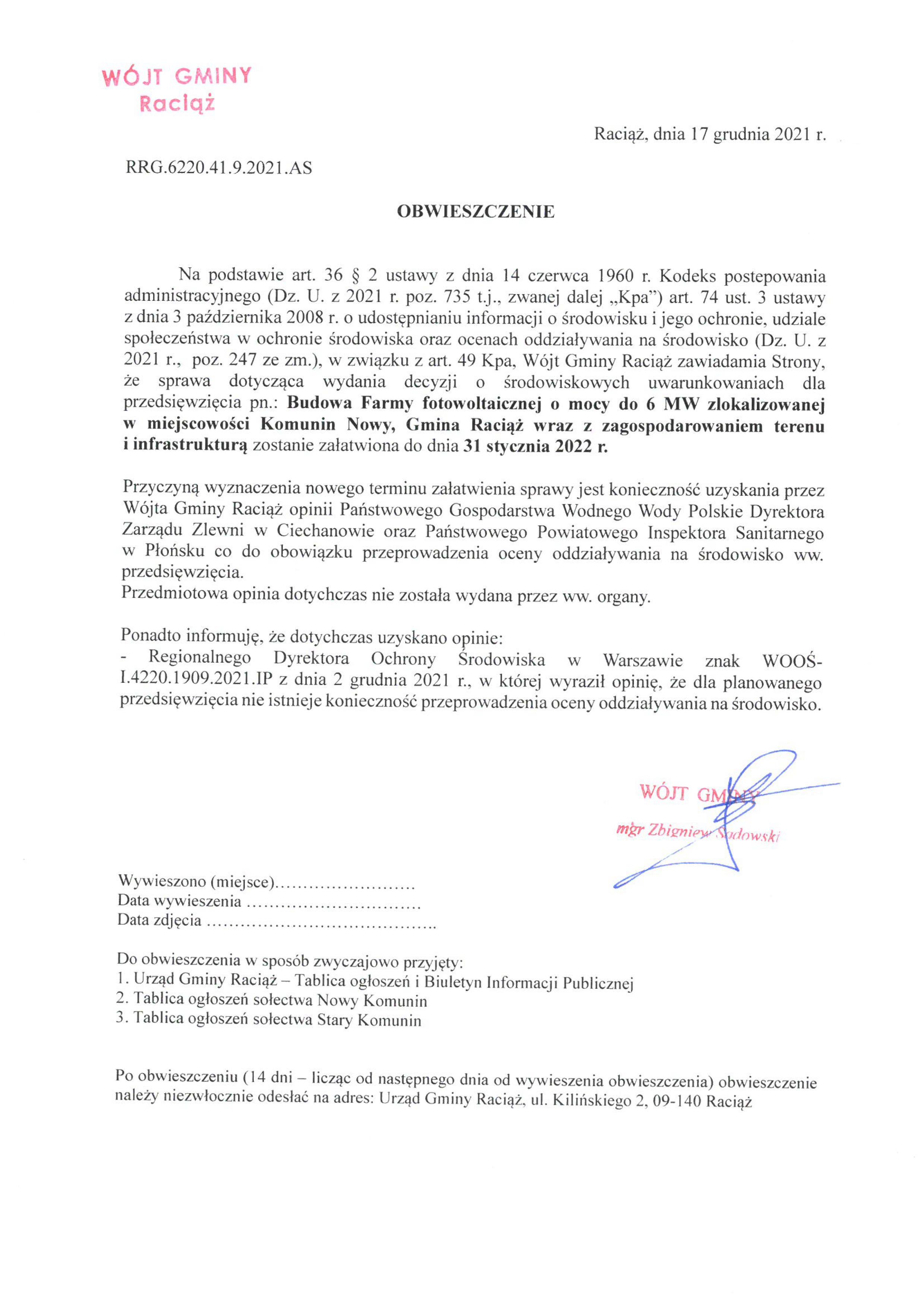 Budowa Farmy fotowoltaicznej o mocy do 6 MW zlokalizowanej w miejscowości Komunin Nowy, Gmina Raciąż wraz z zagospodarowaniem terenu i infrastrukturą
