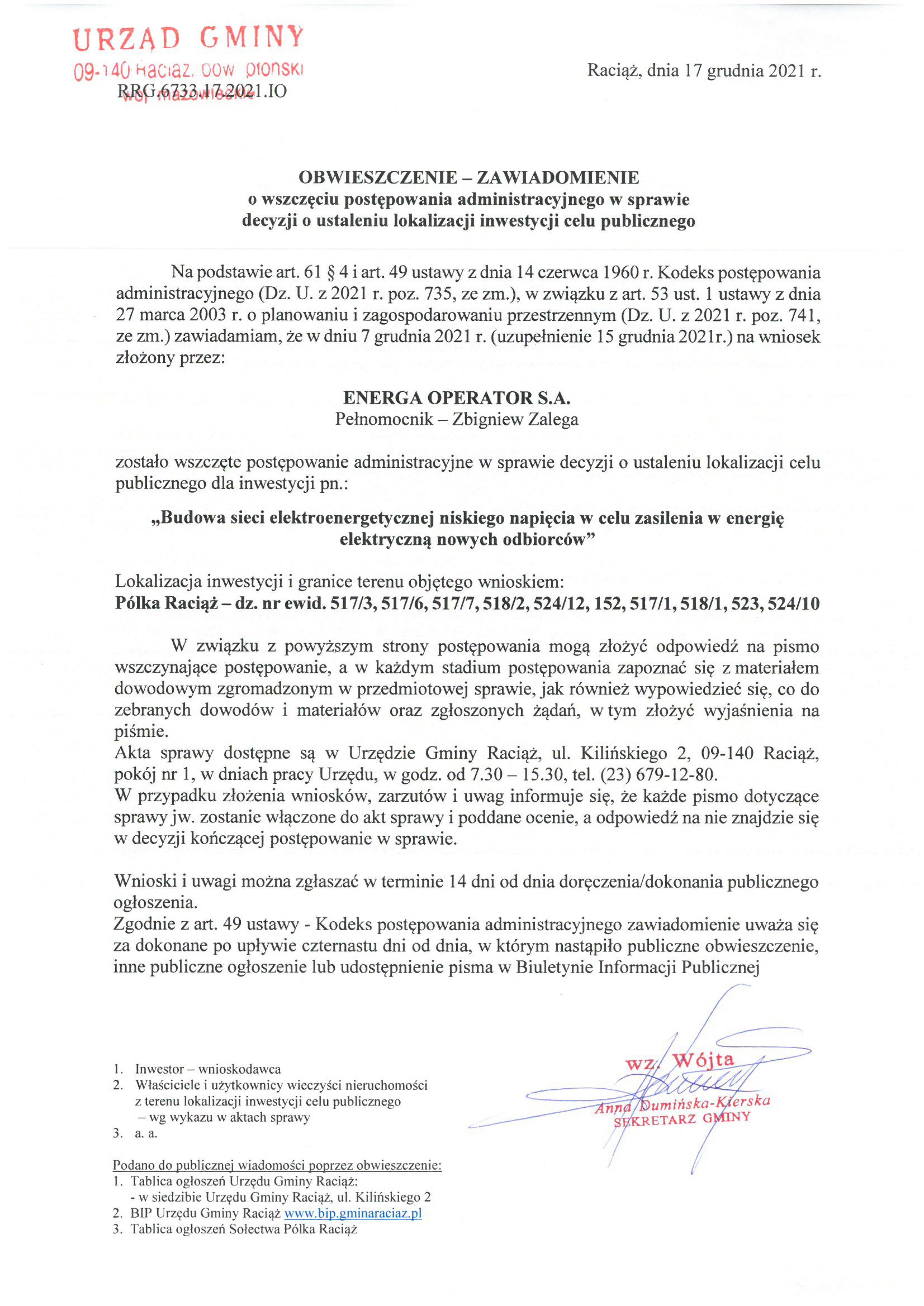 OBWIESZCZENIE O WSZCZĘCIU POSTĘPOWANIA PN : „Budowa sieci elektroenergetycznej niskiego napięcia w celu zasilenia w energię elektryczną nowych odbiorców” w miejscowości Pólka Raciąż