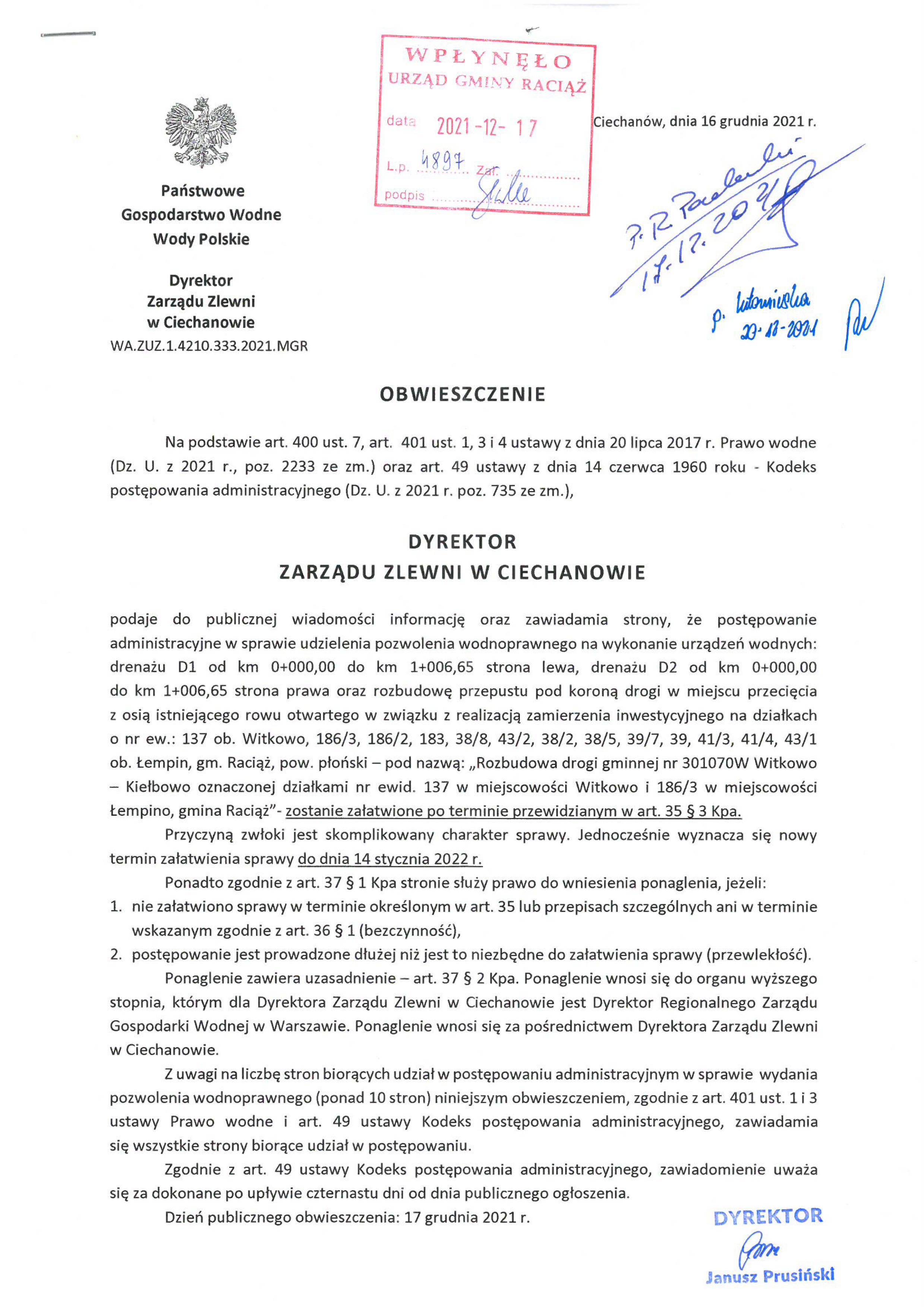 “Obwieszczenie Dyrektora Zarządu Zlewni w Ciechanowie o przedłużeniu terminu postepowania w sprawie udzielenia pozwolenia wodnoprawnego na wykonanie urządzeń wodnych:
