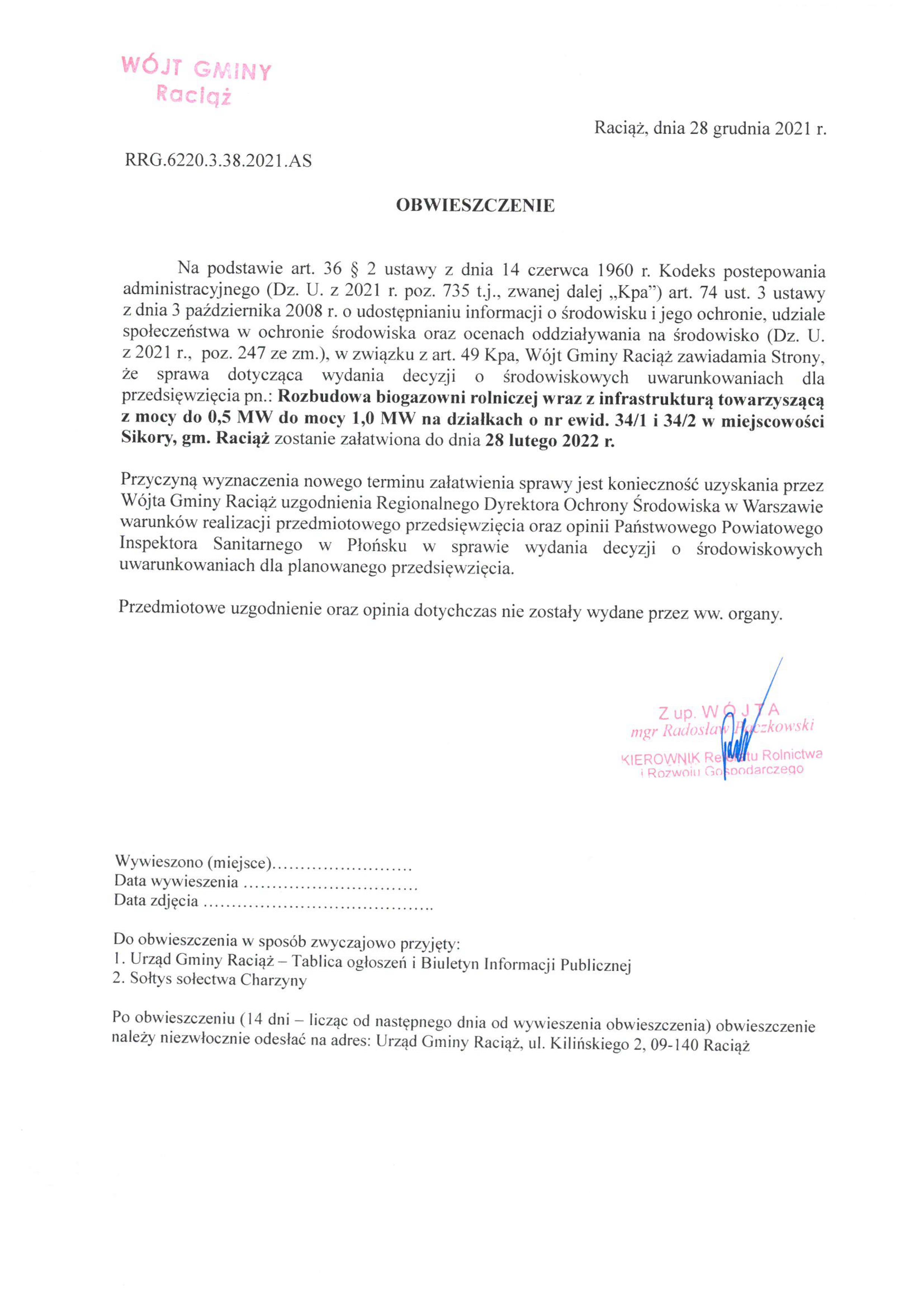 Rozbudowa biogazowni rolniczej wraz z infrastrukturą towarzyszącą z mocy do 0,5 MW do mocy 1,0 MW na działkach o nr ewid. 34/1 i 34/2 w miejscowości Sikory, gm. Raciąż