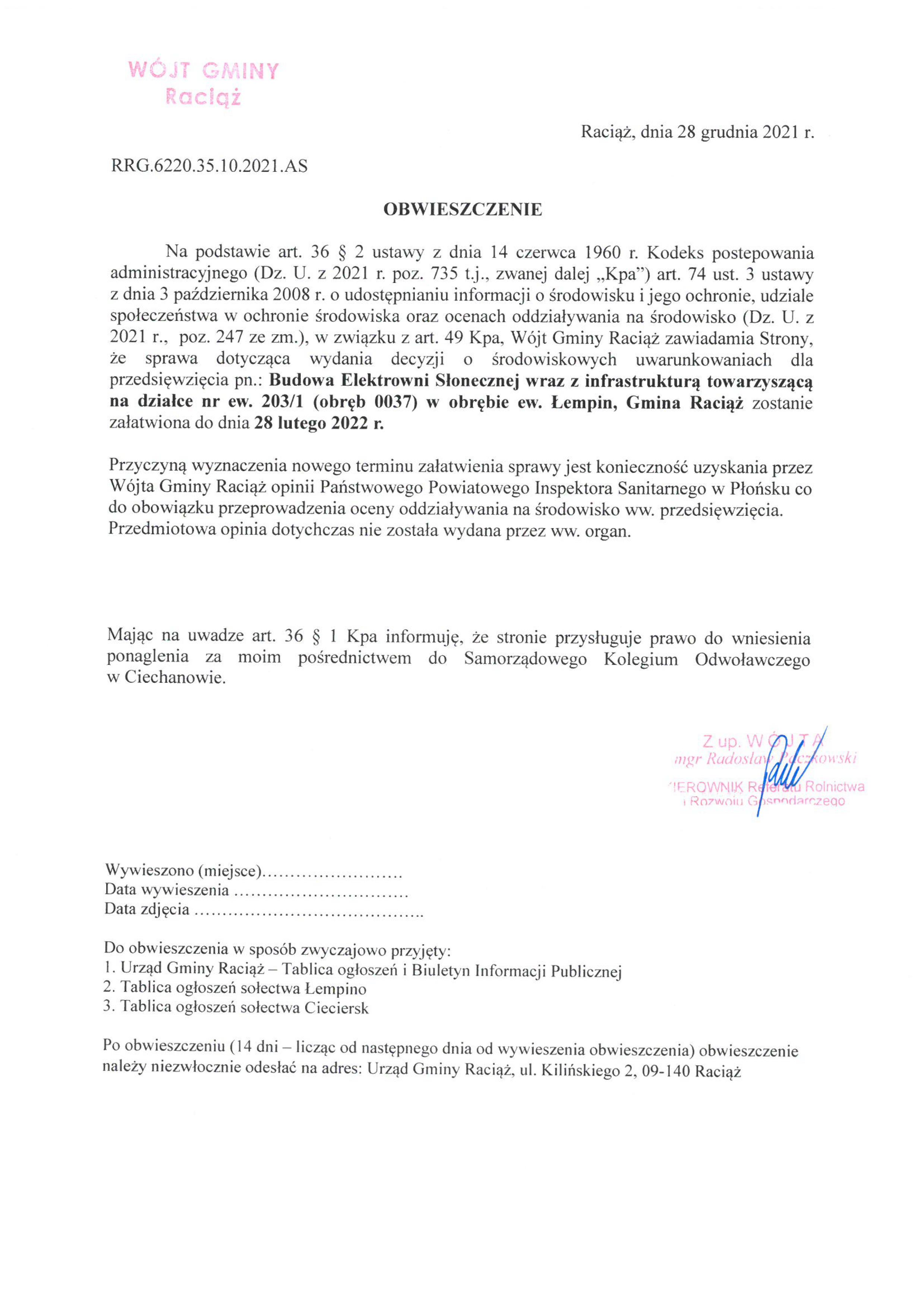 Budowa Elektrowni Słonecznej wraz z infrastrukturą towarzyszącą na działce nr ew. 203/1 (obręb 0037) w obrębie ew. Łempin, Gmina Raciąż