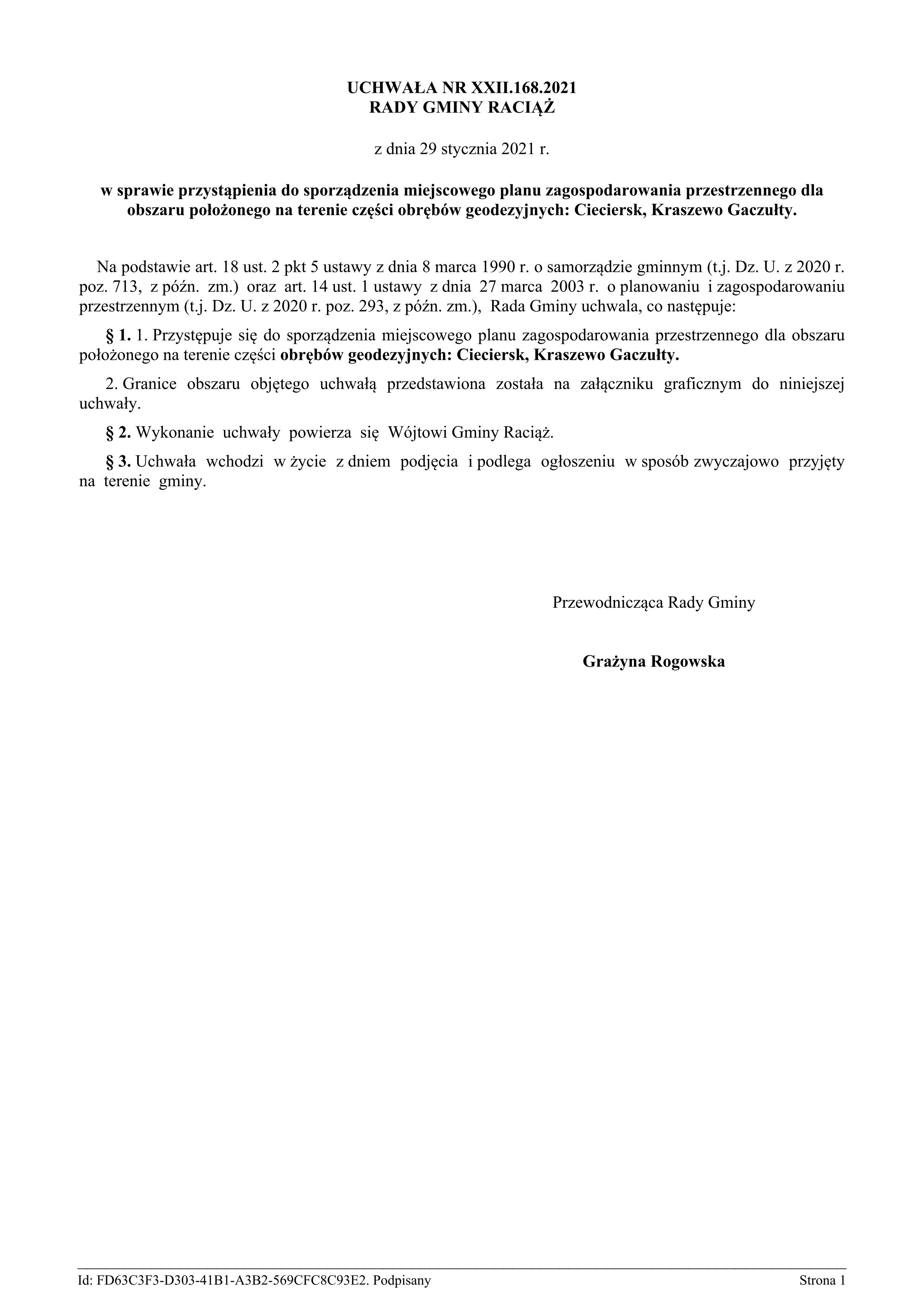 UCHWAŁA Nr XXII.168.2021 RADY GMINY RACIĄŻ z dnia 29 stycznia 2021 roku