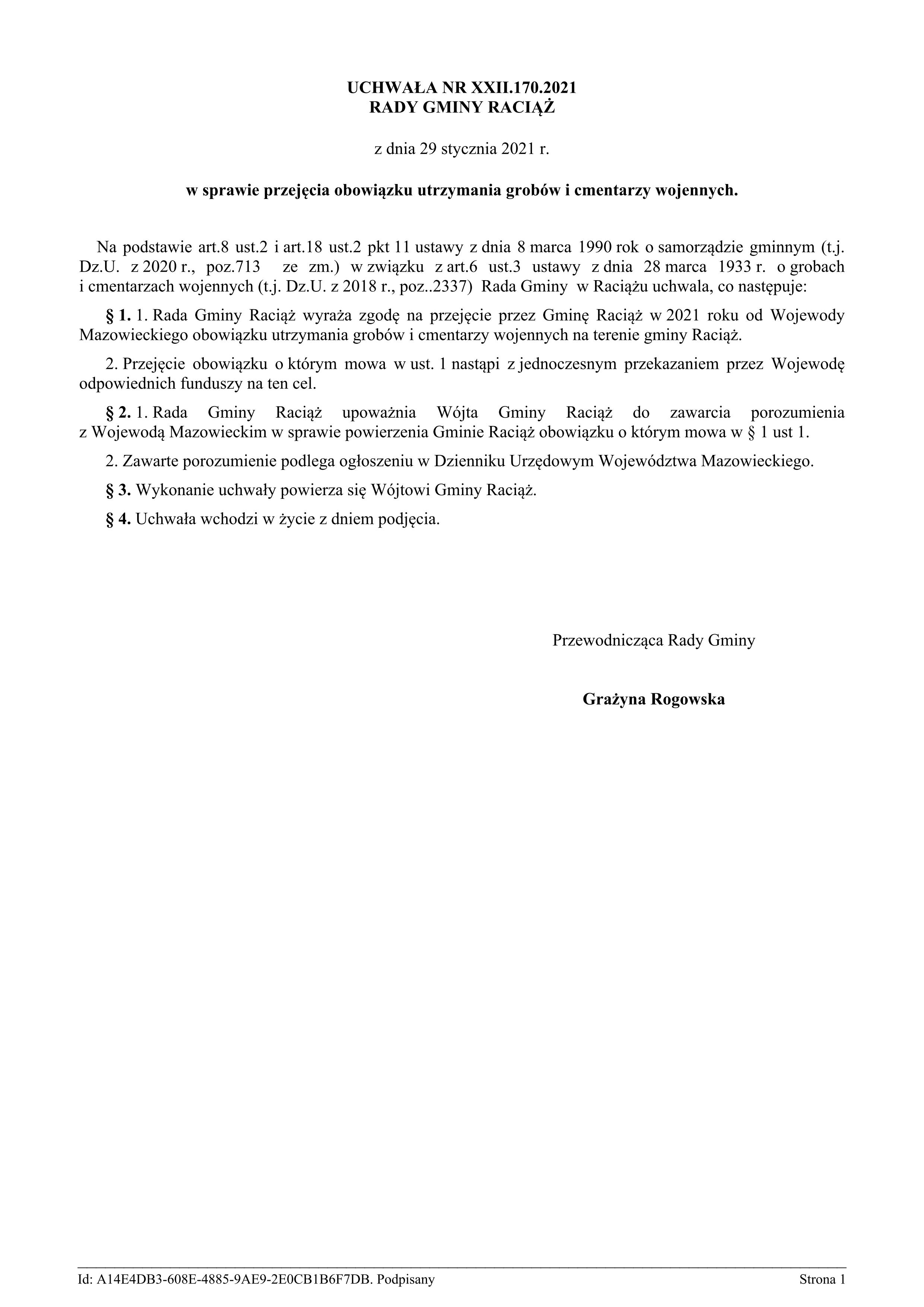 UCHWAŁA Nr XXII.170.2021 RADY GMINY RACIĄŻ z dnia 29 stycznia 2021 roku
