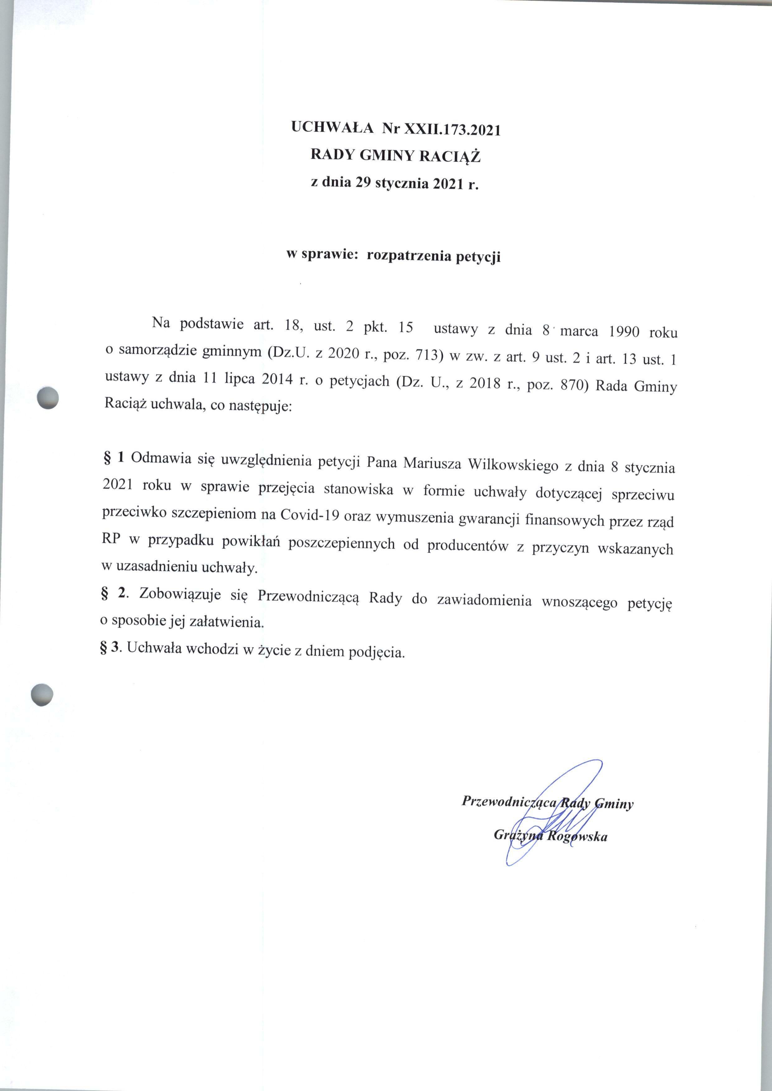 UCHWAŁA Nr XXII.173.2021 RADY GMINY RACIĄŻ z dnia 29 stycznia 2021 roku