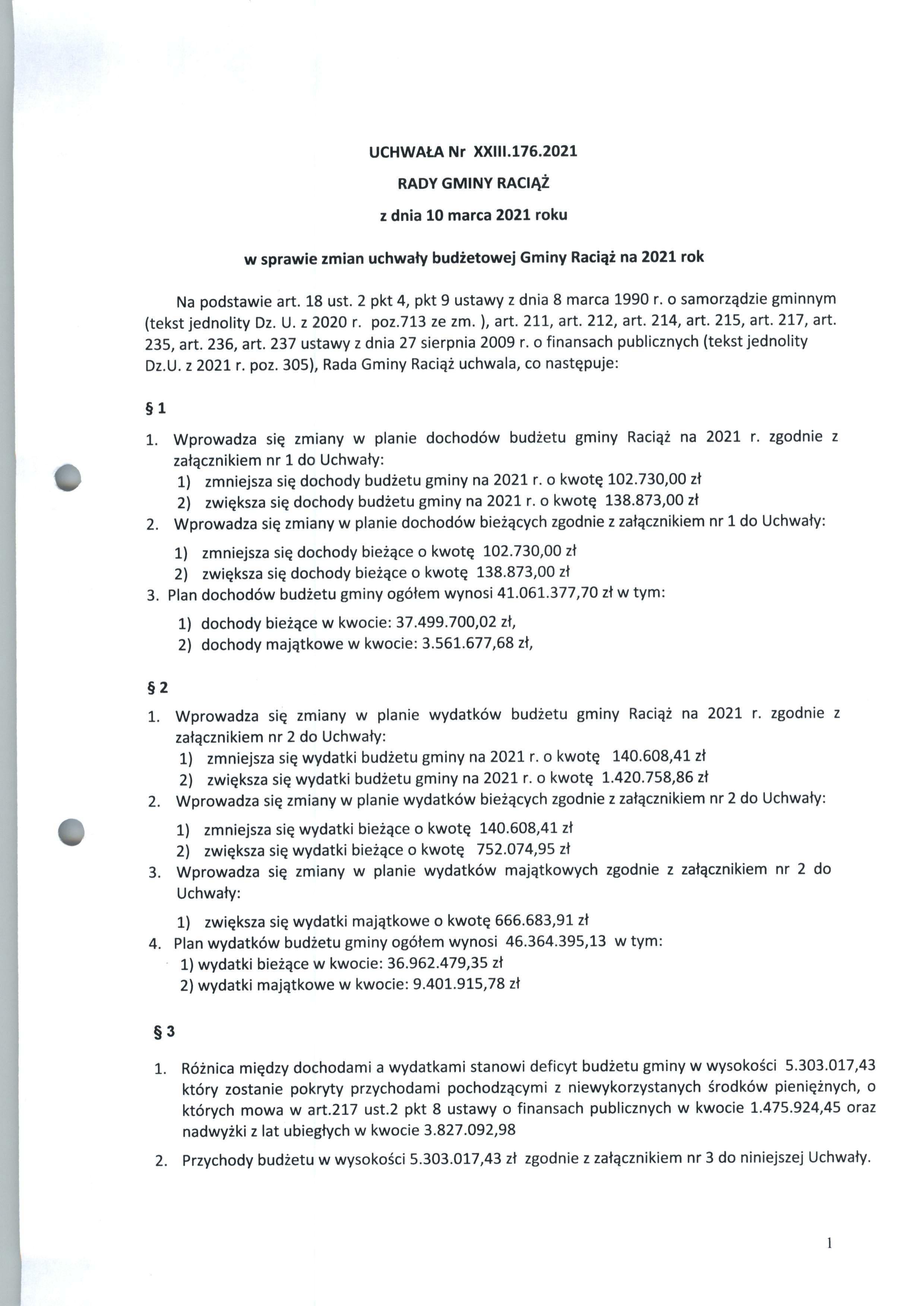 UCHWAŁA Nr XXIII.176.2021 RADY GMINY RACIĄŻ z dnia 10 marca 2021 roku