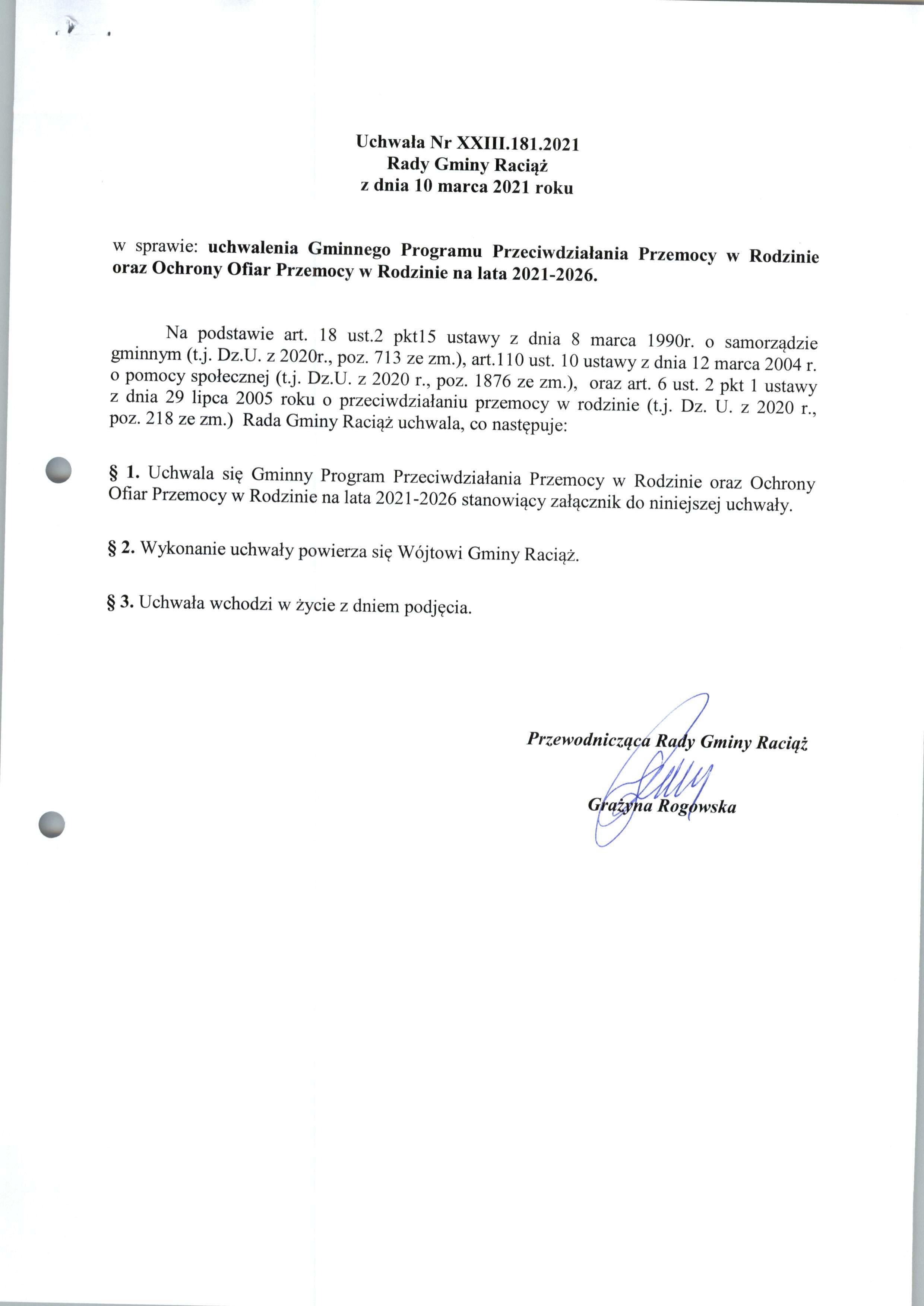 UCHWAŁA Nr XXIII.181.2021 RADY GMINY RACIĄŻ z dnia 10 marca 2021 roku