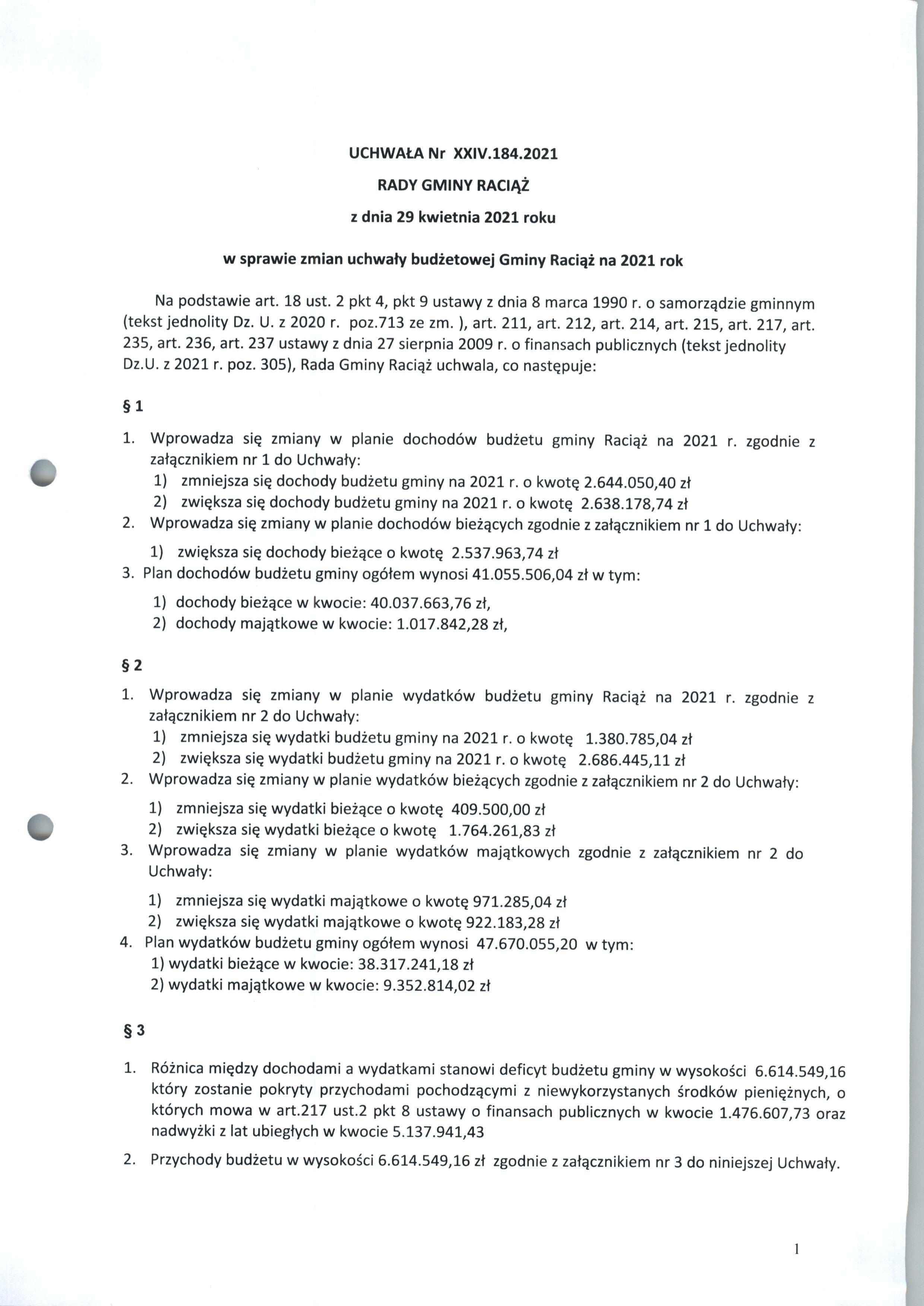 UCHWAŁA Nr XXIV.184.2021 RADY GMINY RACIĄŻ z dnia 29 kwietnia 2021 roku
