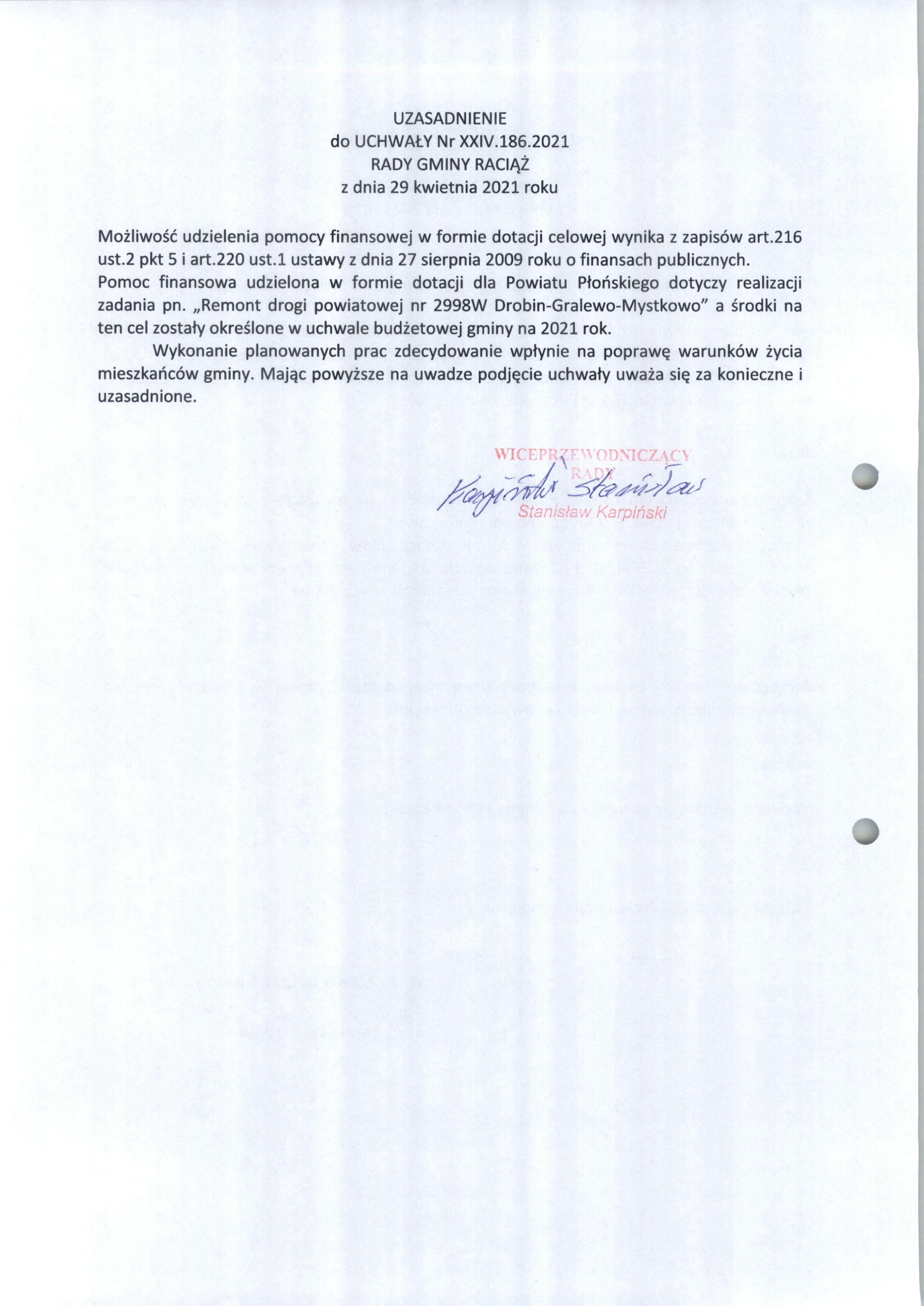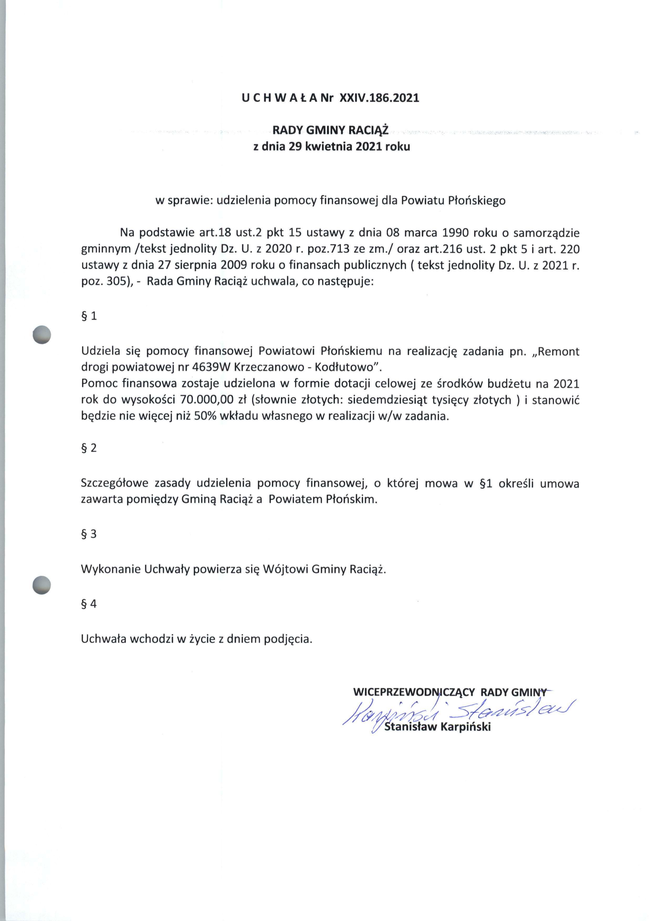 UCHWAŁA Nr XXIV.186.2021 RADY GMINY RACIĄŻ z dnia 29 kwietnia 2021 roku