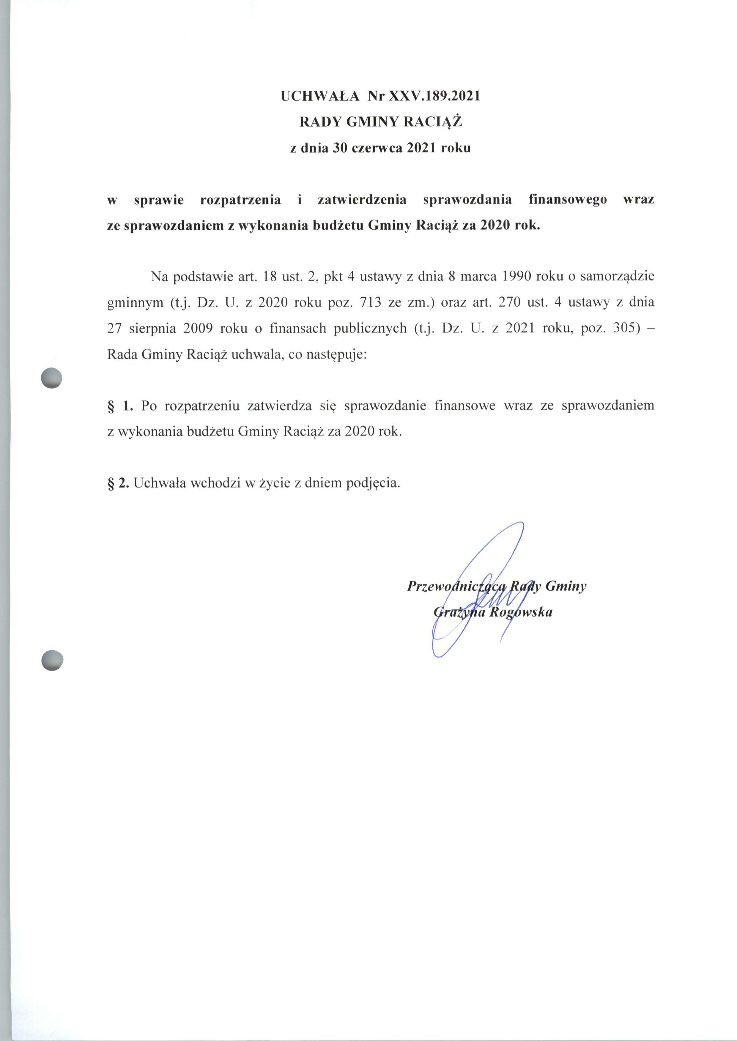 UCHWAŁA Nr XXV.189.2021 RADY GMINY RACIĄŻ z dnia 30 czerwca 2021 roku