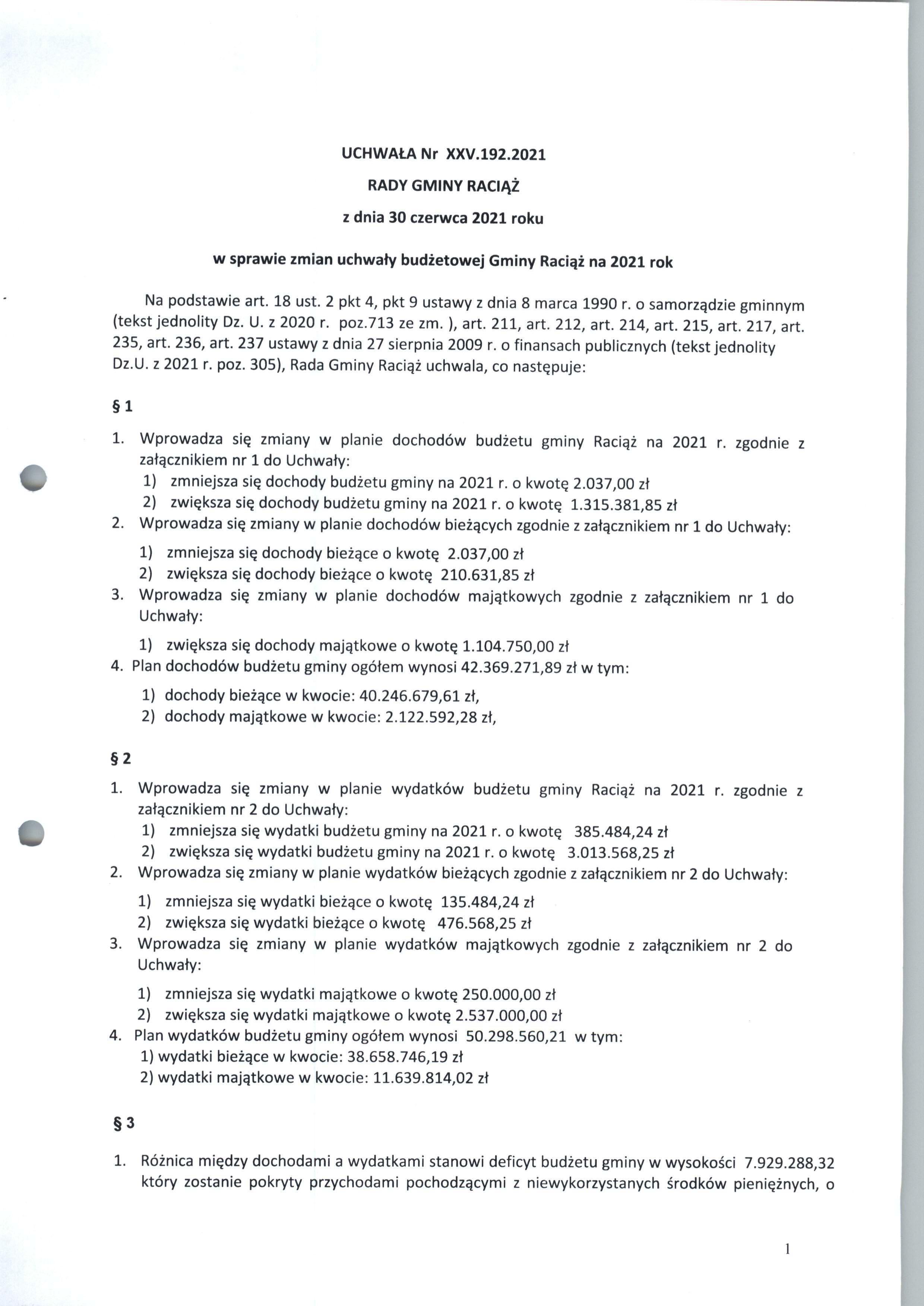 UCHWAŁA Nr XXV.192.2021 RADY GMINY RACIĄŻ z dnia 30 czerwca 2021 roku