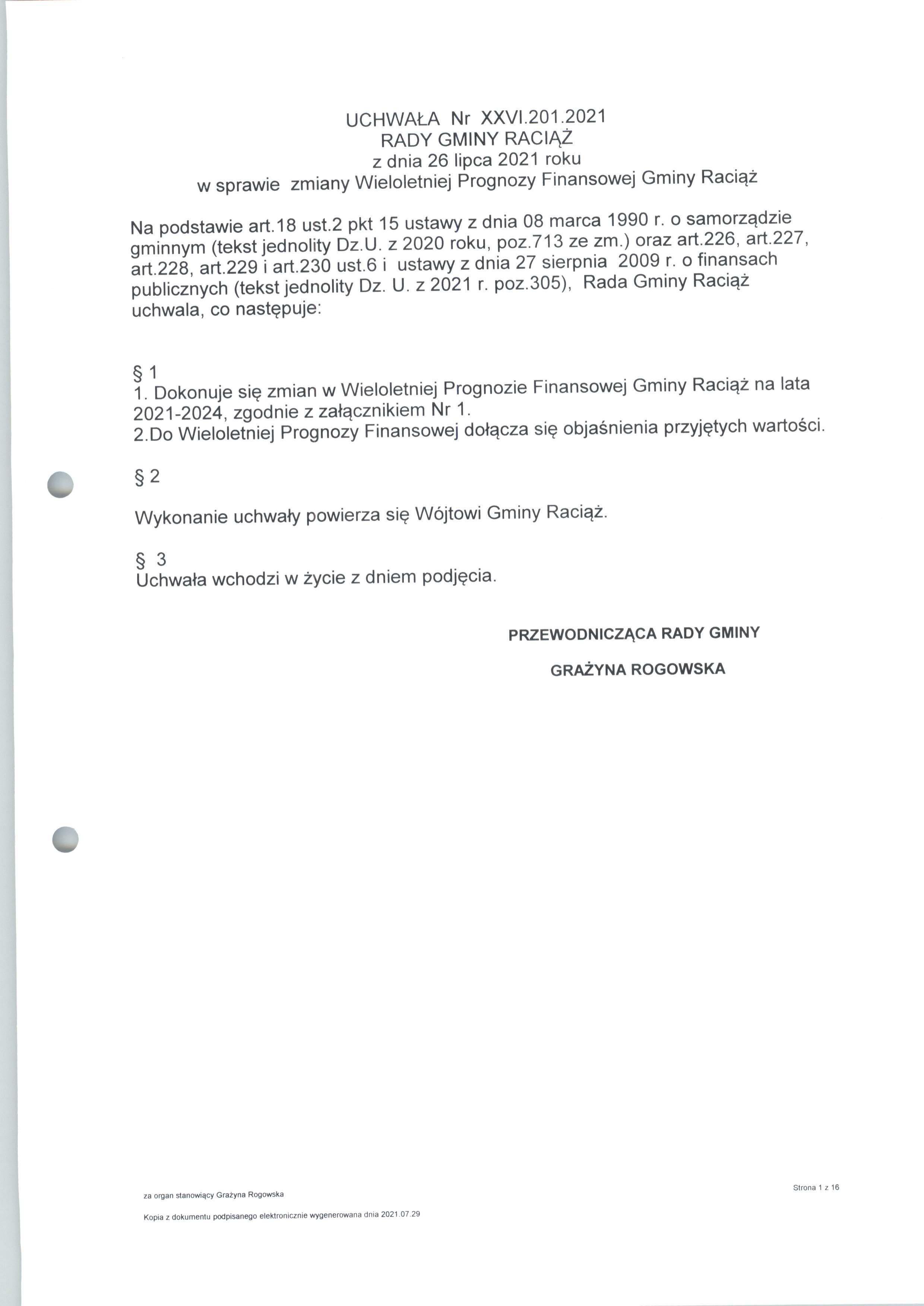 UCHWAŁA Nr XXVI.201.2021 RADY GMINY RACIĄŻ z dnia 26 lipca 2021 roku