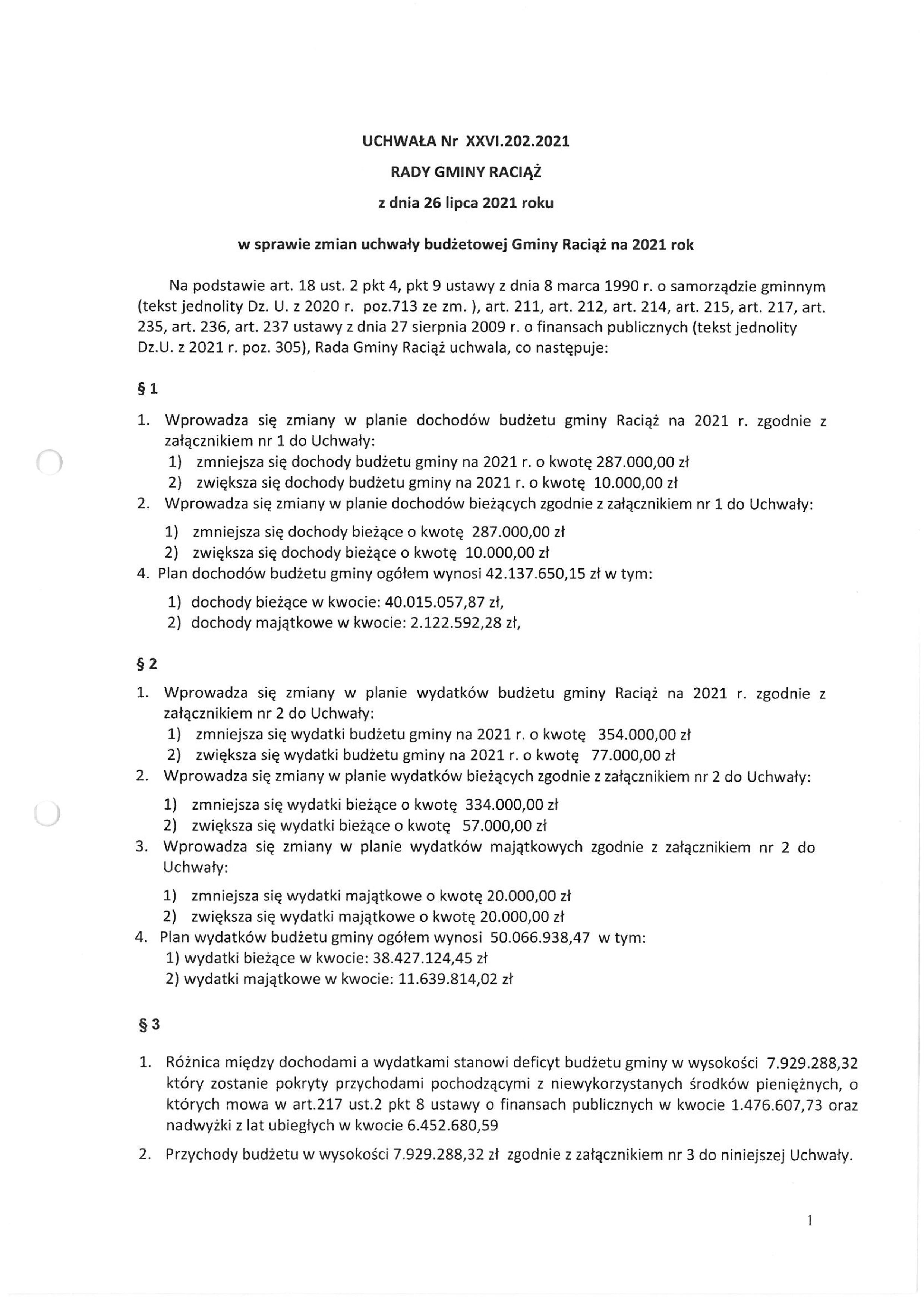 UCHWAŁA Nr XXVI.202.2021 RADY GMINY RACIĄŻ z dnia 26 lipca 2021 roku