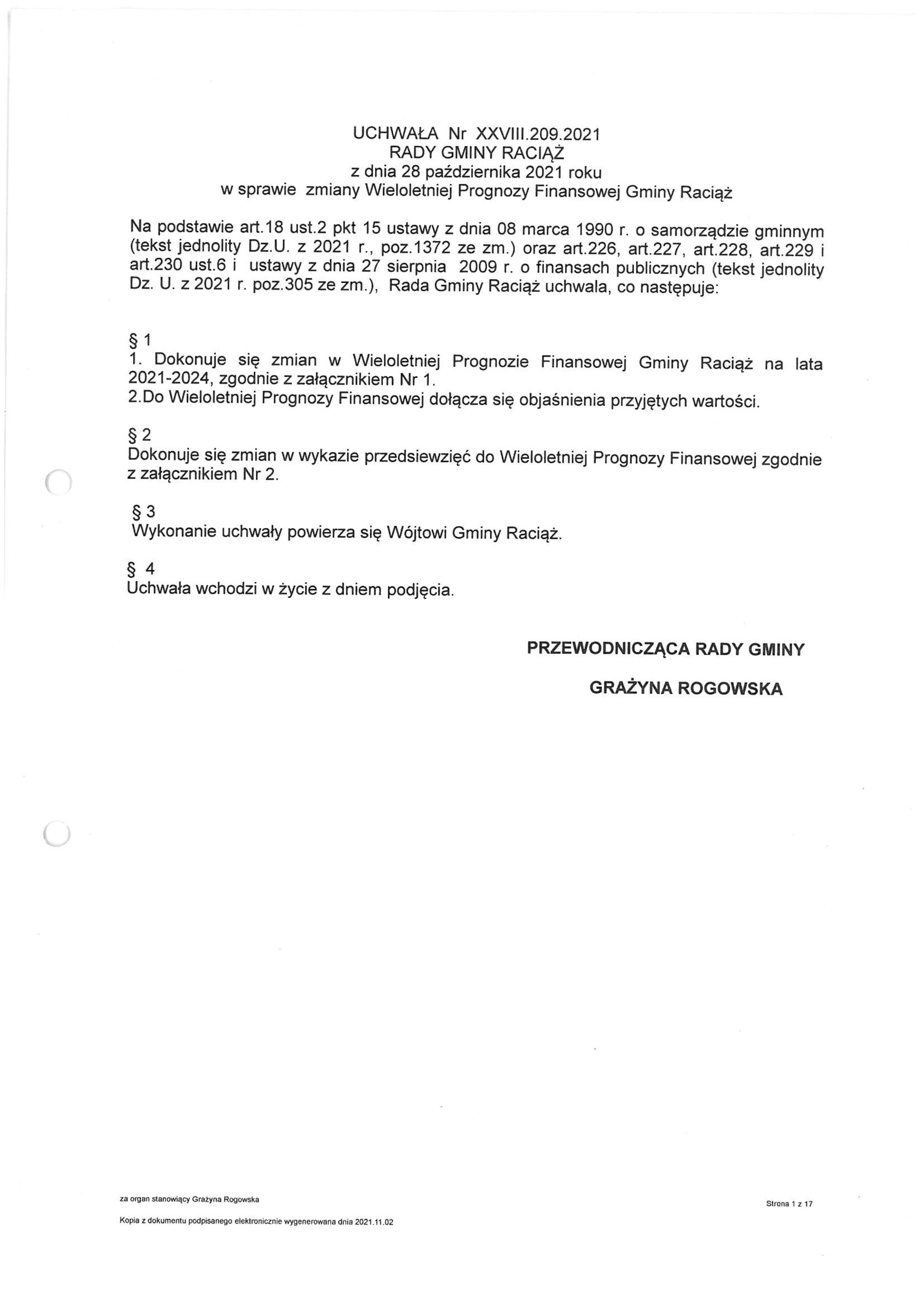 UCHWAŁA Nr XXVIII.209.2021 RADY GMINY RACIĄŻ z dnia 28 października 2021 roku