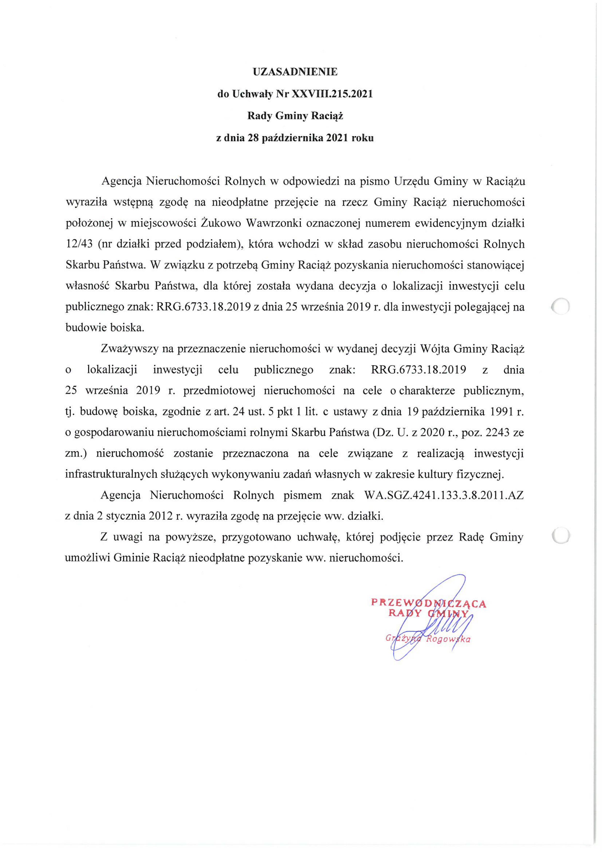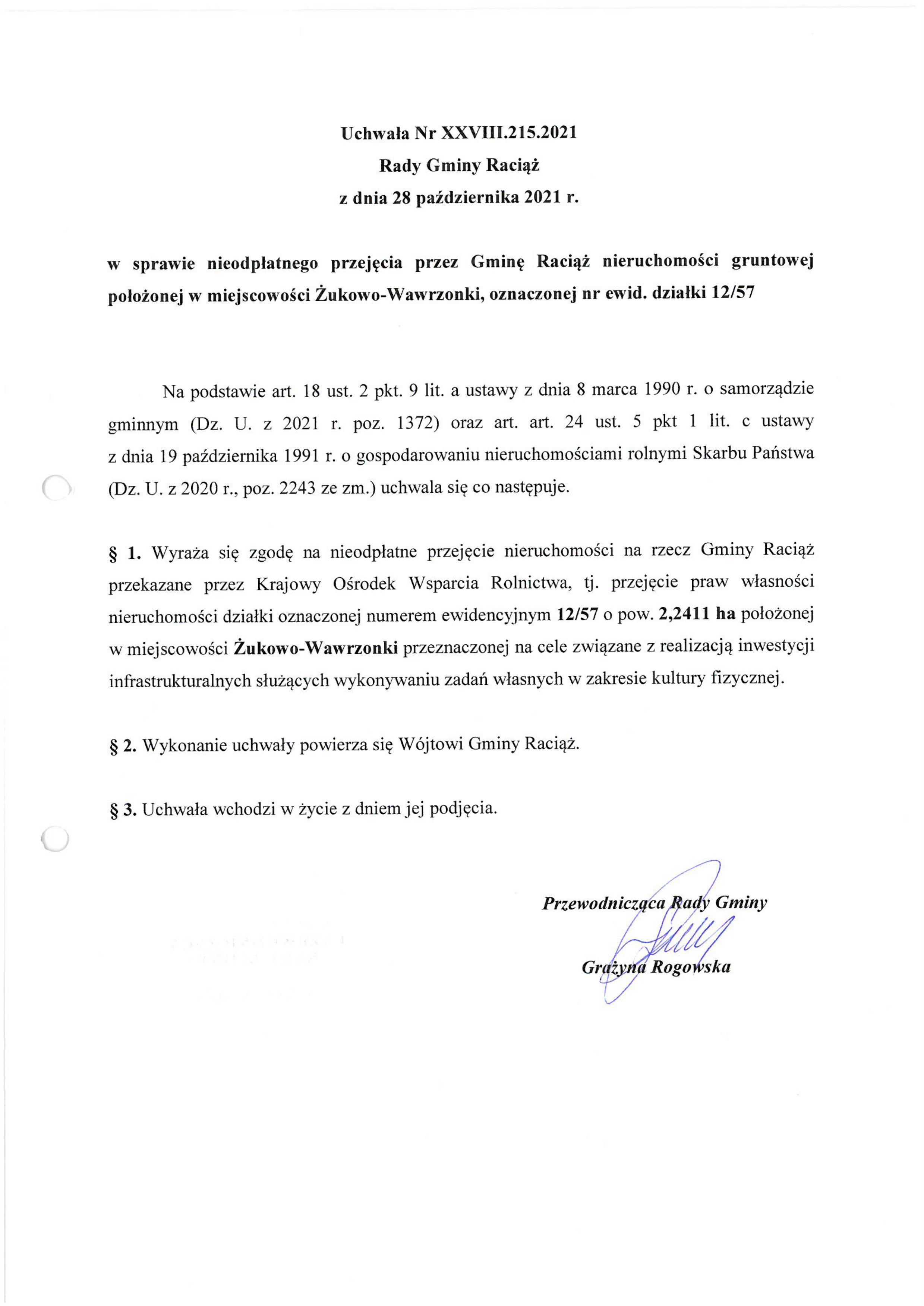 UCHWAŁA Nr XXVIII.215.2021 RADY GMINY RACIĄŻ z dnia 28 października 2021 roku
